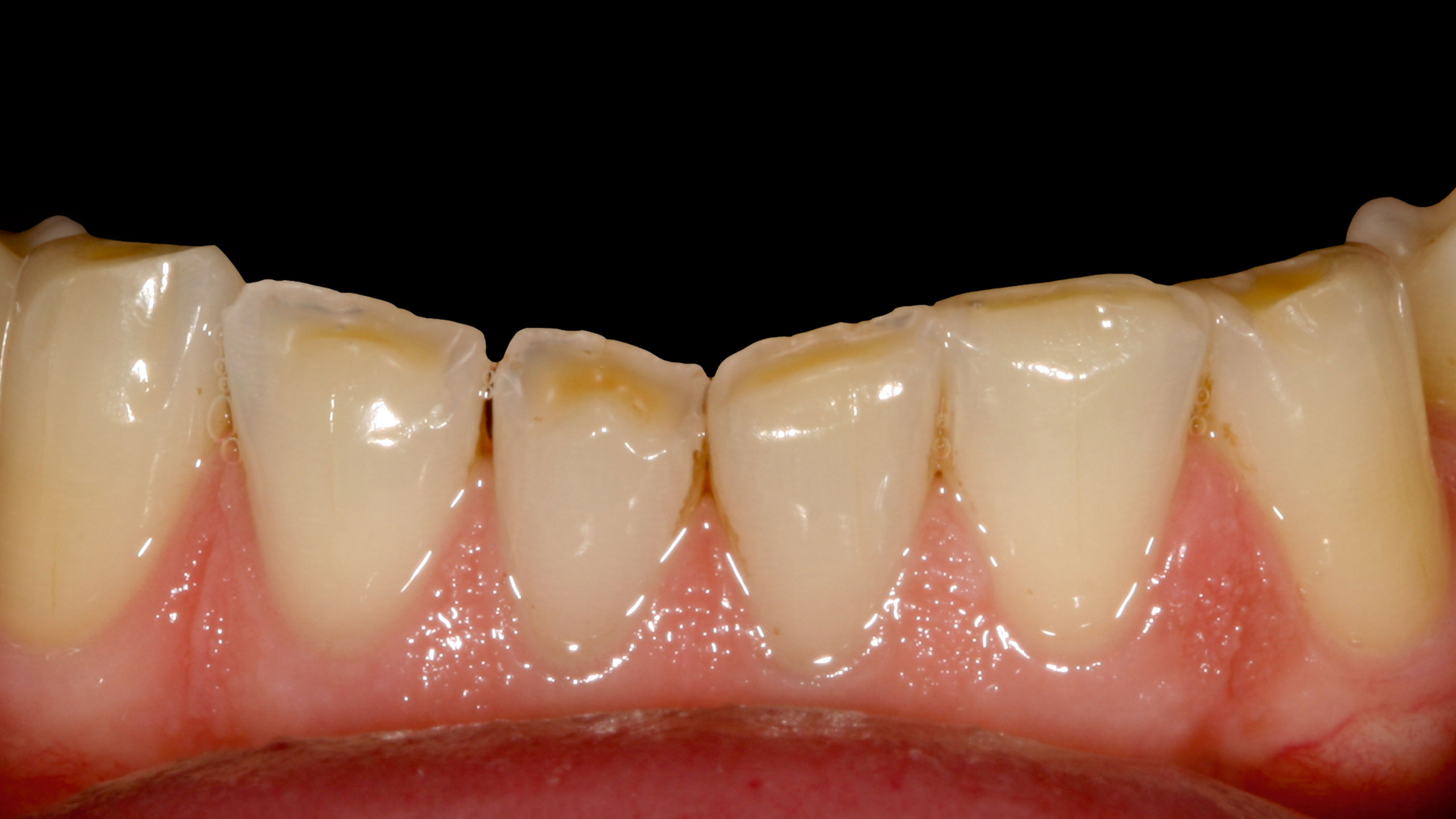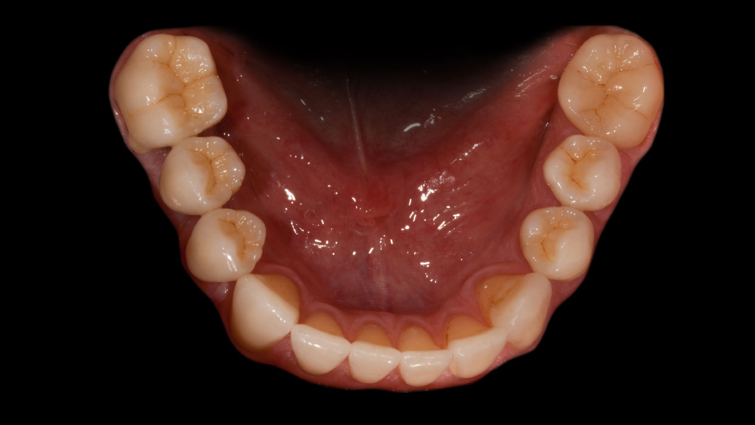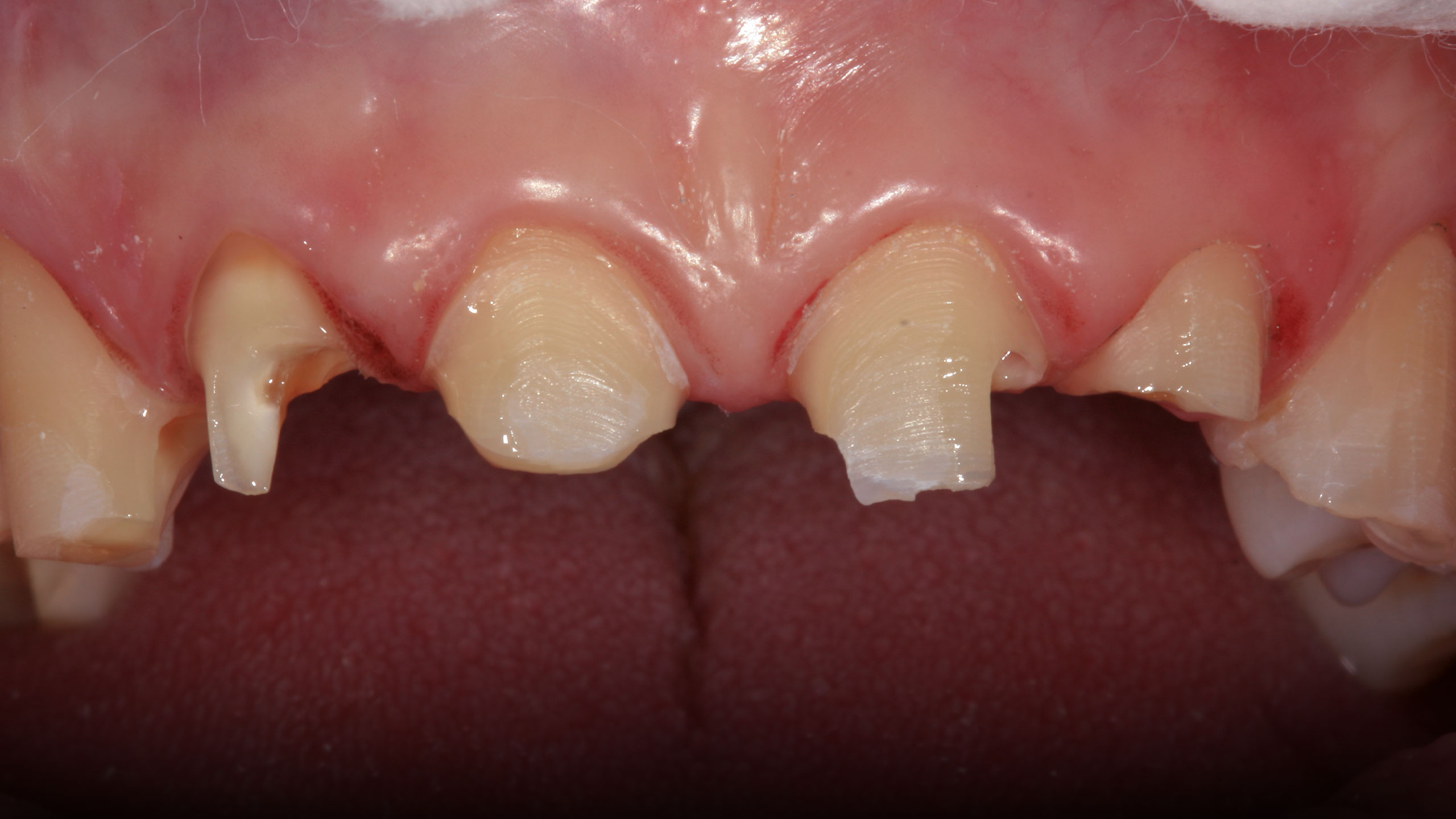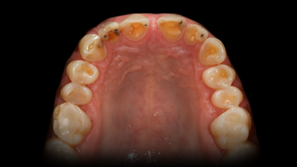 Die Abbildungen der Ausgangsituation zeigen deutlich den massiven Verlust an Zahnhartsubstanz (Abb. 1 bis 3). Im Seitenzahnbereich zeichneten sich massive Funktionsspuren ab (Abb. 4 und 5), die infolge des Verlusts der Front-Eckzahnführung entstanden waren. Der Biss war deutlich abgesunken, die Ästhetik im Frontzahnbereich stark gestört und die Seitenzähne standen lückig, Zahn 45 fehlte (Abb. 6 bis 9). Die Oberkieferfrontzähne wiesen palatinal umfangreiche Erosionen auf (Abb. 8). Kiefergelenk und Kaumuskulatur waren hingegen beschwerdefrei.