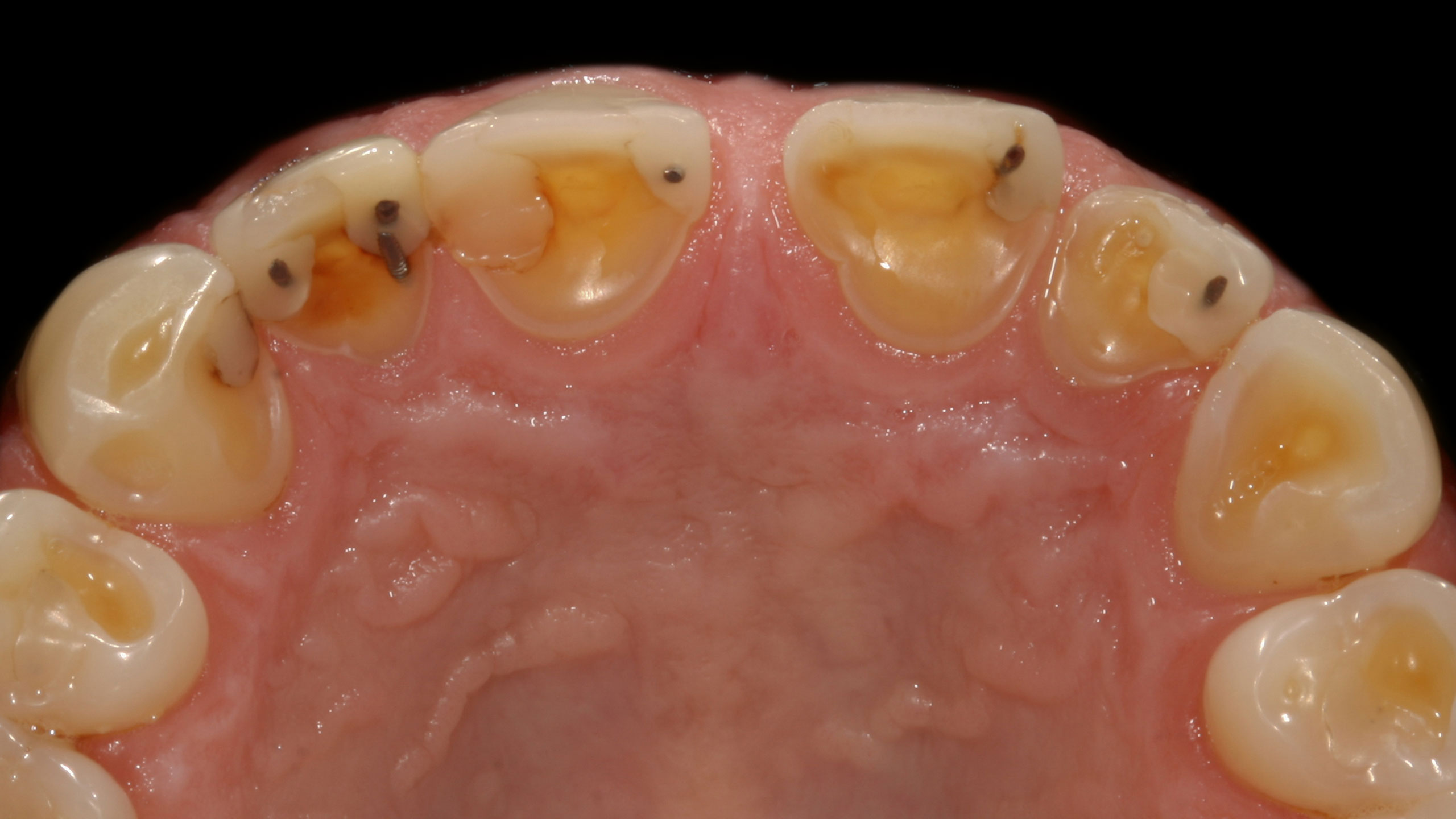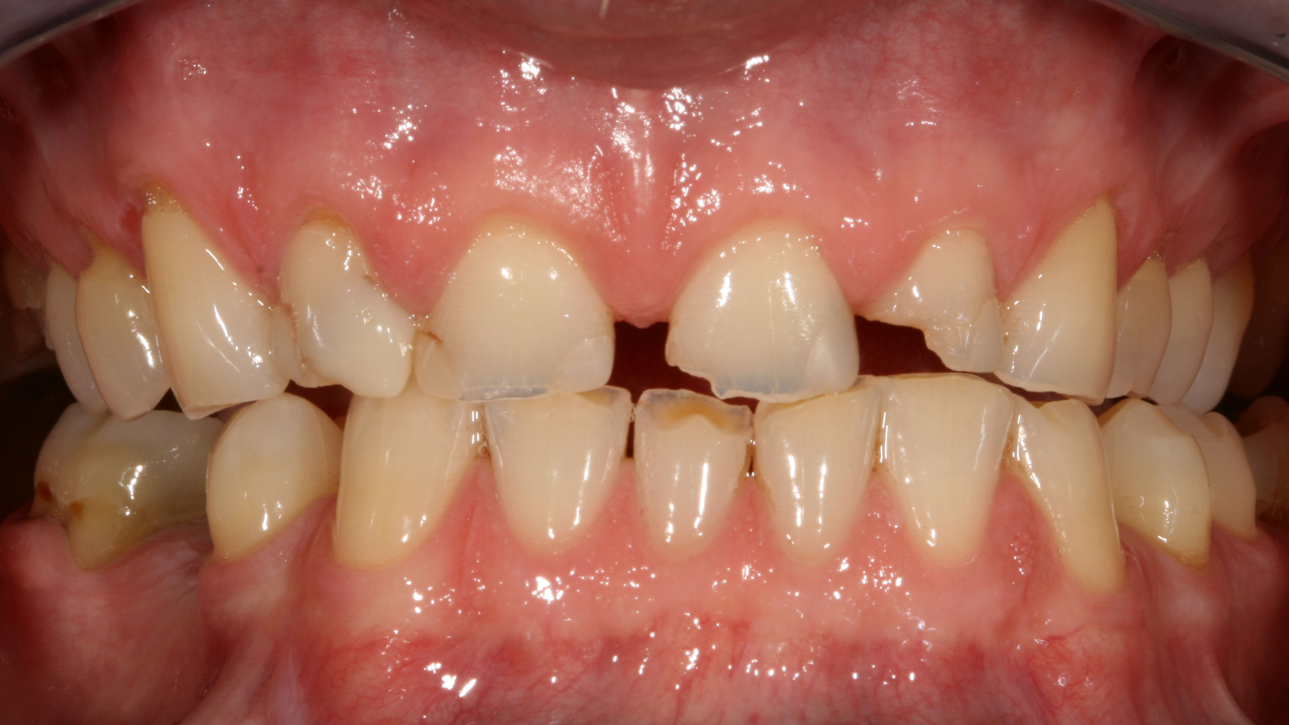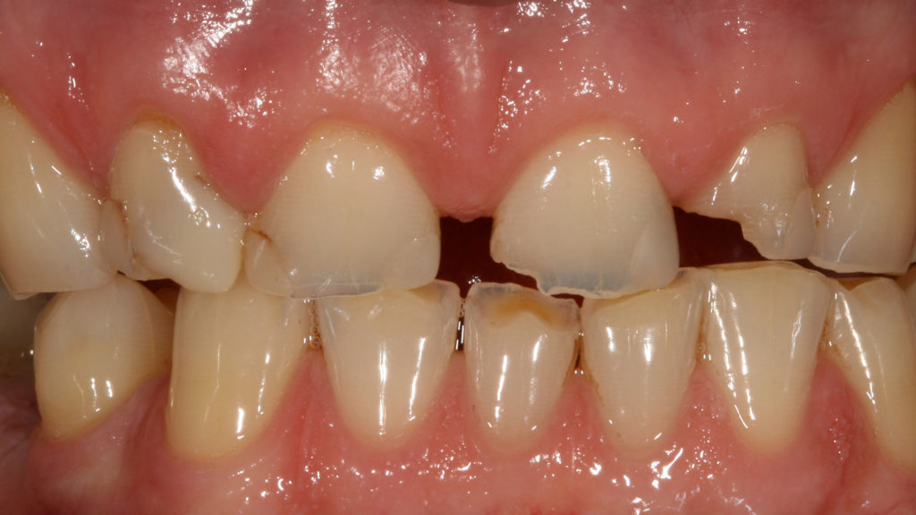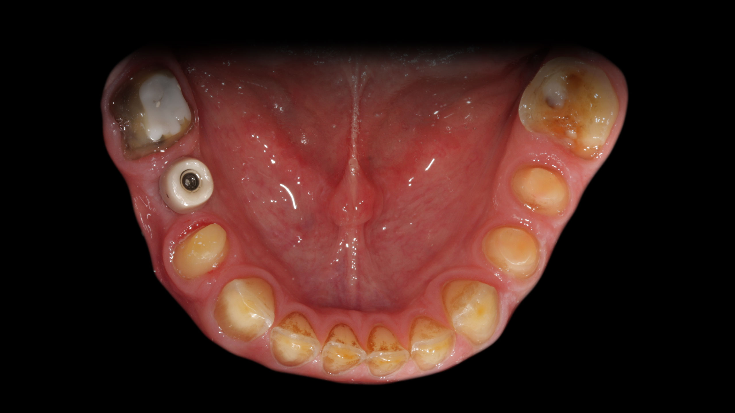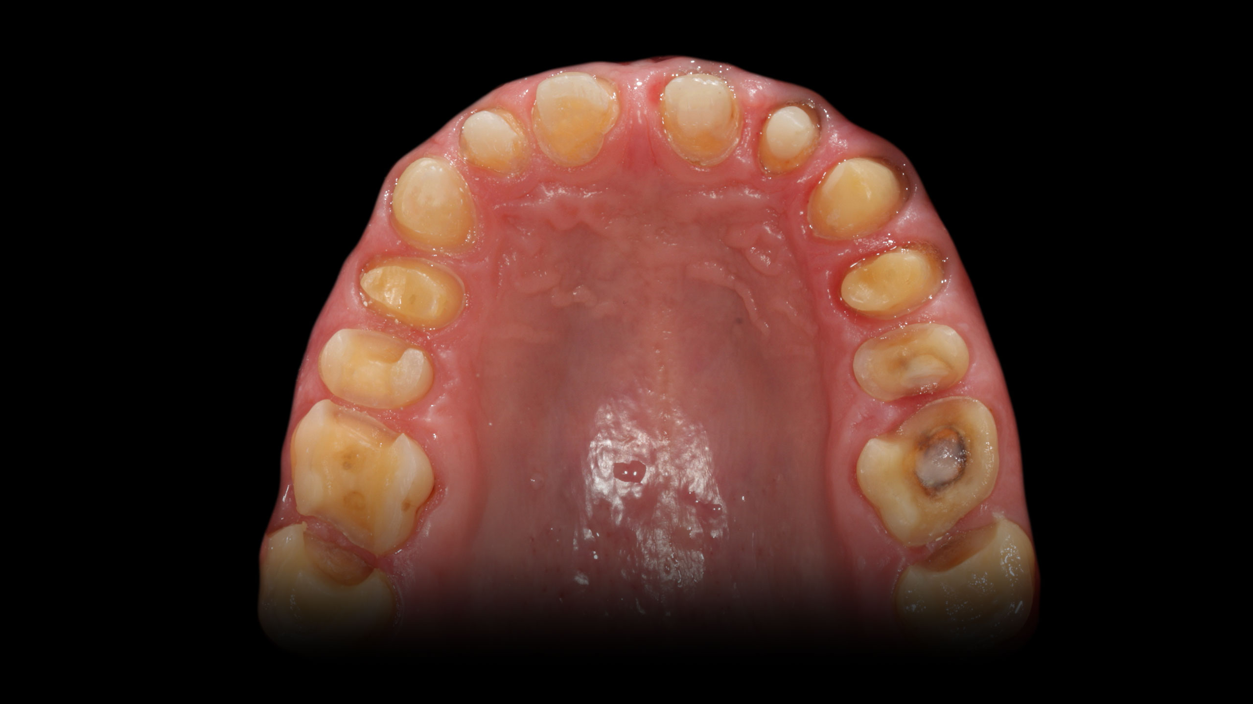 Die Abbildungen der Ausgangsituation zeigen deutlich den massiven Verlust an Zahnhartsubstanz (Abb. 1 bis 3). Im Seitenzahnbereich zeichneten sich massive Funktionsspuren ab (Abb. 4 und 5), die infolge des Verlusts der Front-Eckzahnführung entstanden waren. Der Biss war deutlich abgesunken, die Ästhetik im Frontzahnbereich stark gestört und die Seitenzähne standen lückig, Zahn 45 fehlte (Abb. 6 bis 9). Die Oberkieferfrontzähne wiesen palatinal umfangreiche Erosionen auf (Abb. 8). Kiefergelenk und Kaumuskulatur waren hingegen beschwerdefrei.