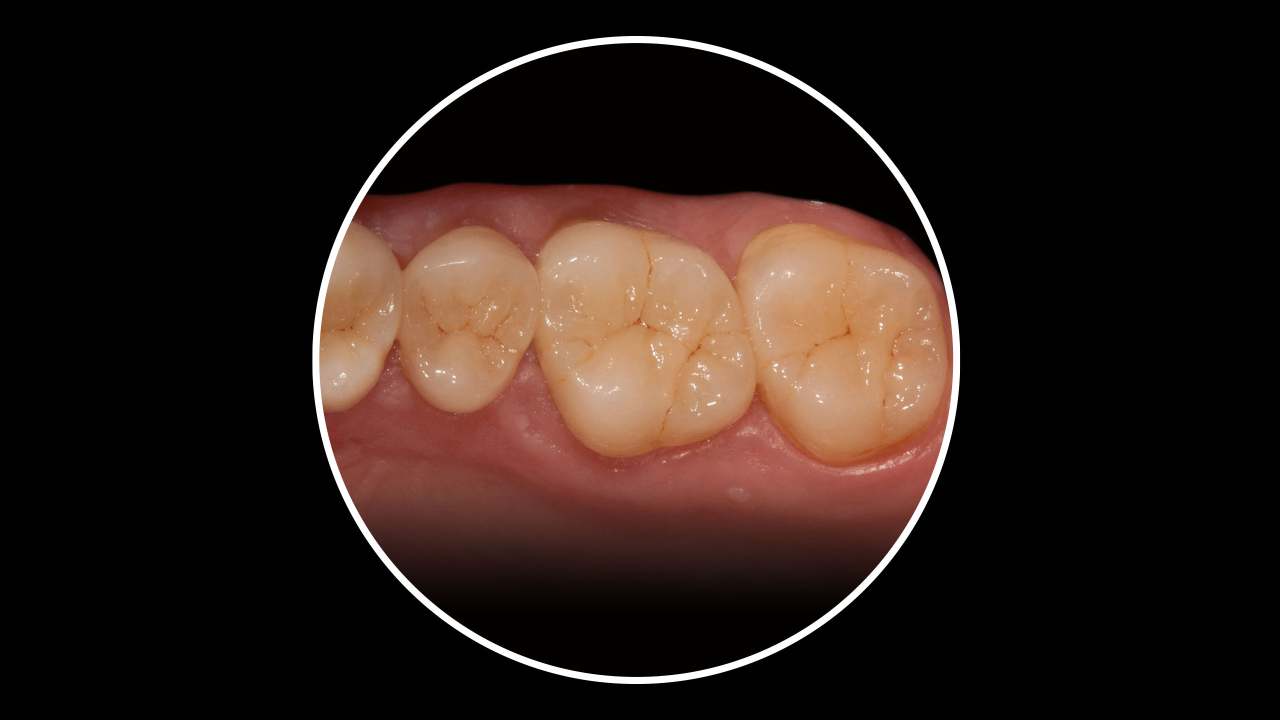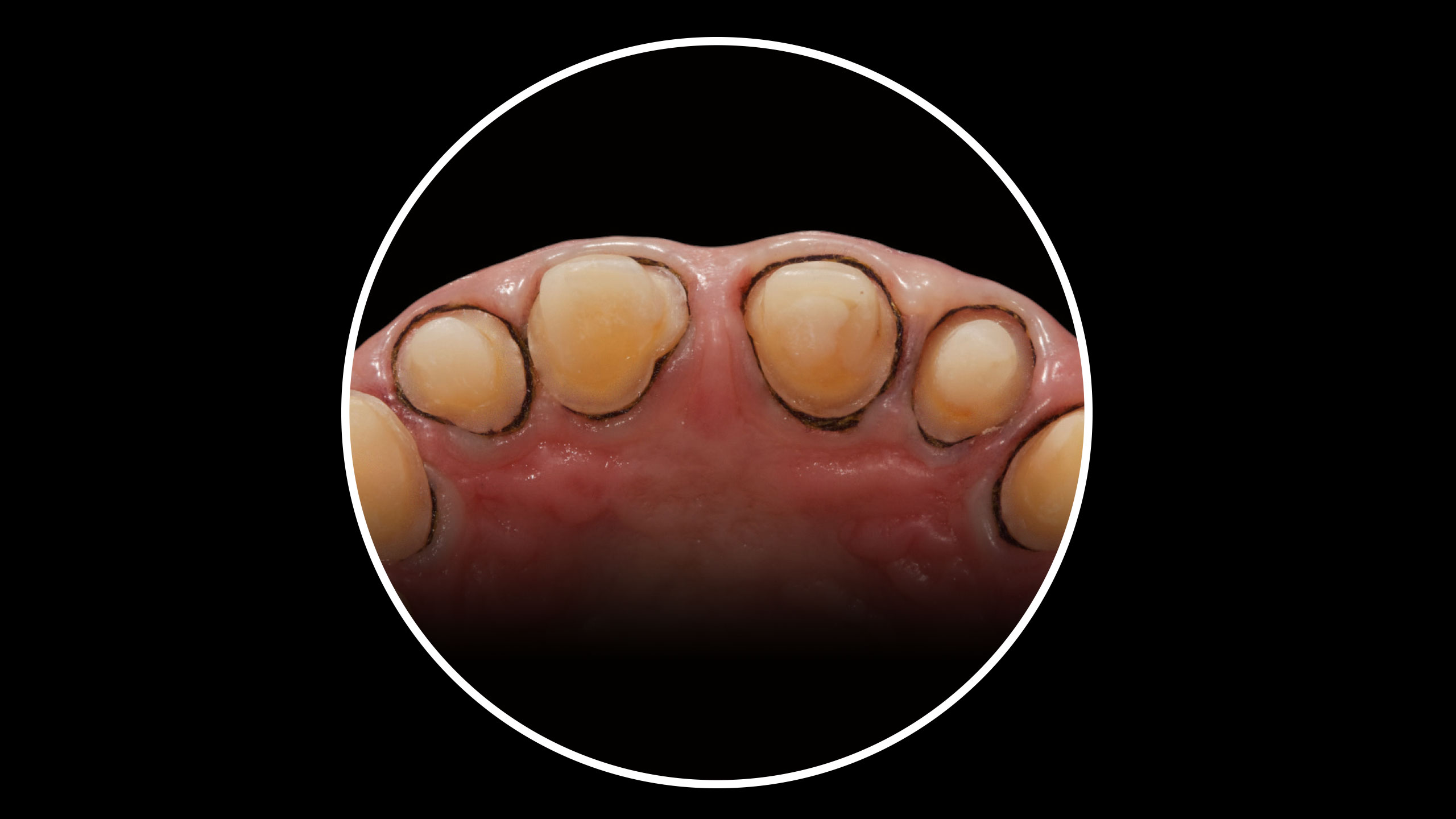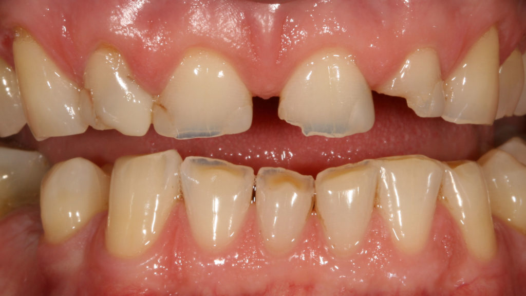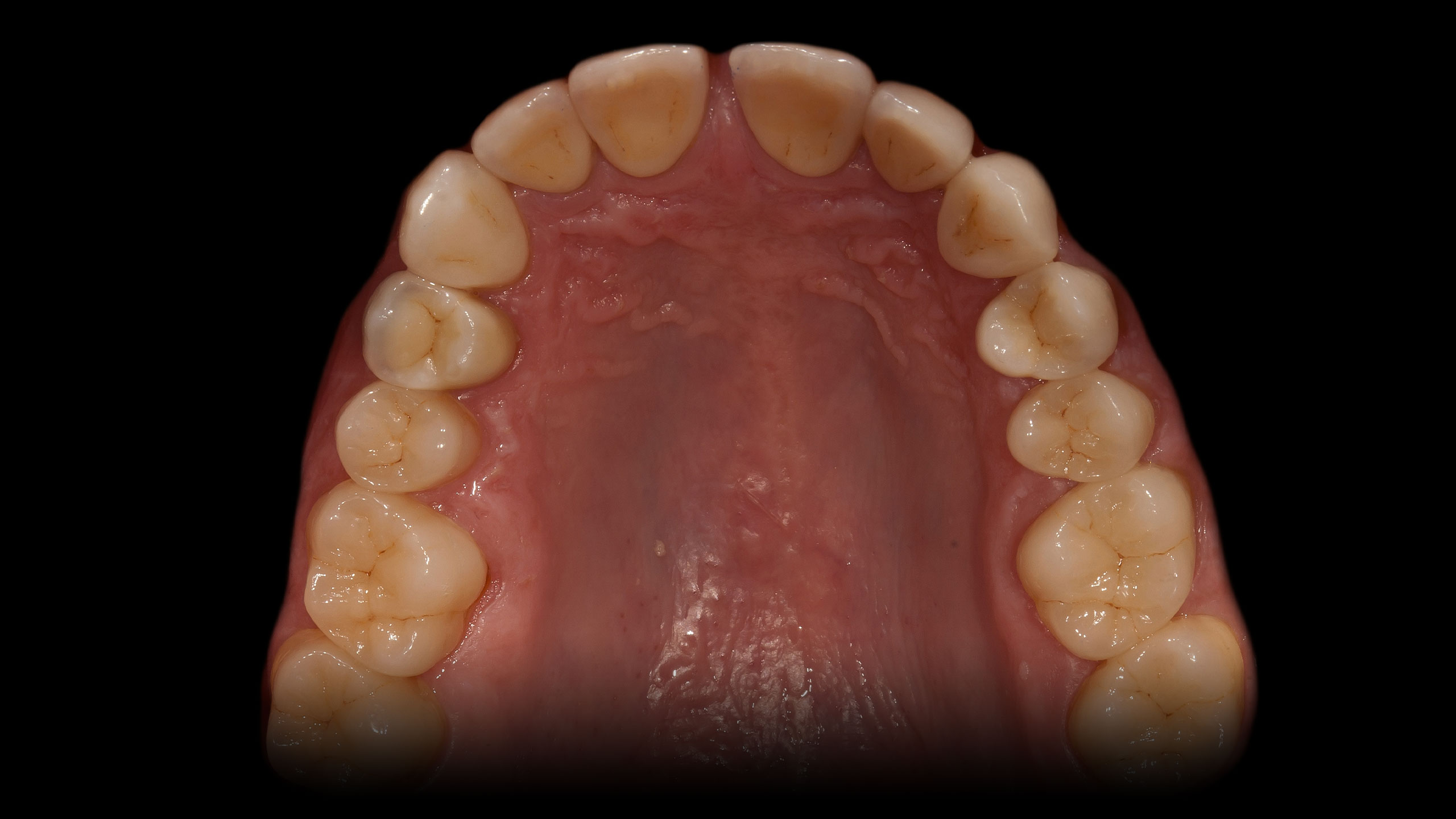 Die Abbildungen der Ausgangsituation zeigen deutlich den massiven Verlust an Zahnhartsubstanz (Abb. 1 bis 3). Im Seitenzahnbereich zeichneten sich massive Funktionsspuren ab (Abb. 4 und 5), die infolge des Verlusts der Front-Eckzahnführung entstanden waren. Der Biss war deutlich abgesunken, die Ästhetik im Frontzahnbereich stark gestört und die Seitenzähne standen lückig, Zahn 45 fehlte (Abb. 6 bis 9). Die Oberkieferfrontzähne wiesen palatinal umfangreiche Erosionen auf (Abb. 8). Kiefergelenk und Kaumuskulatur waren hingegen beschwerdefrei.