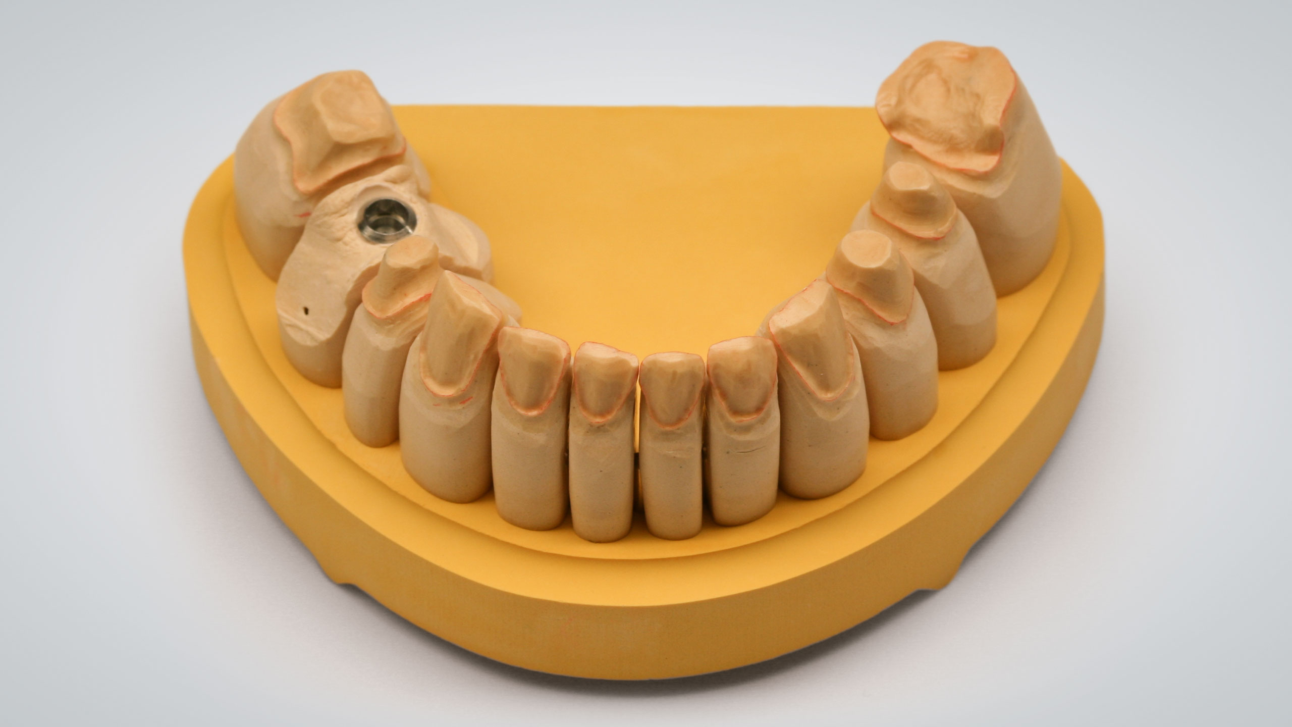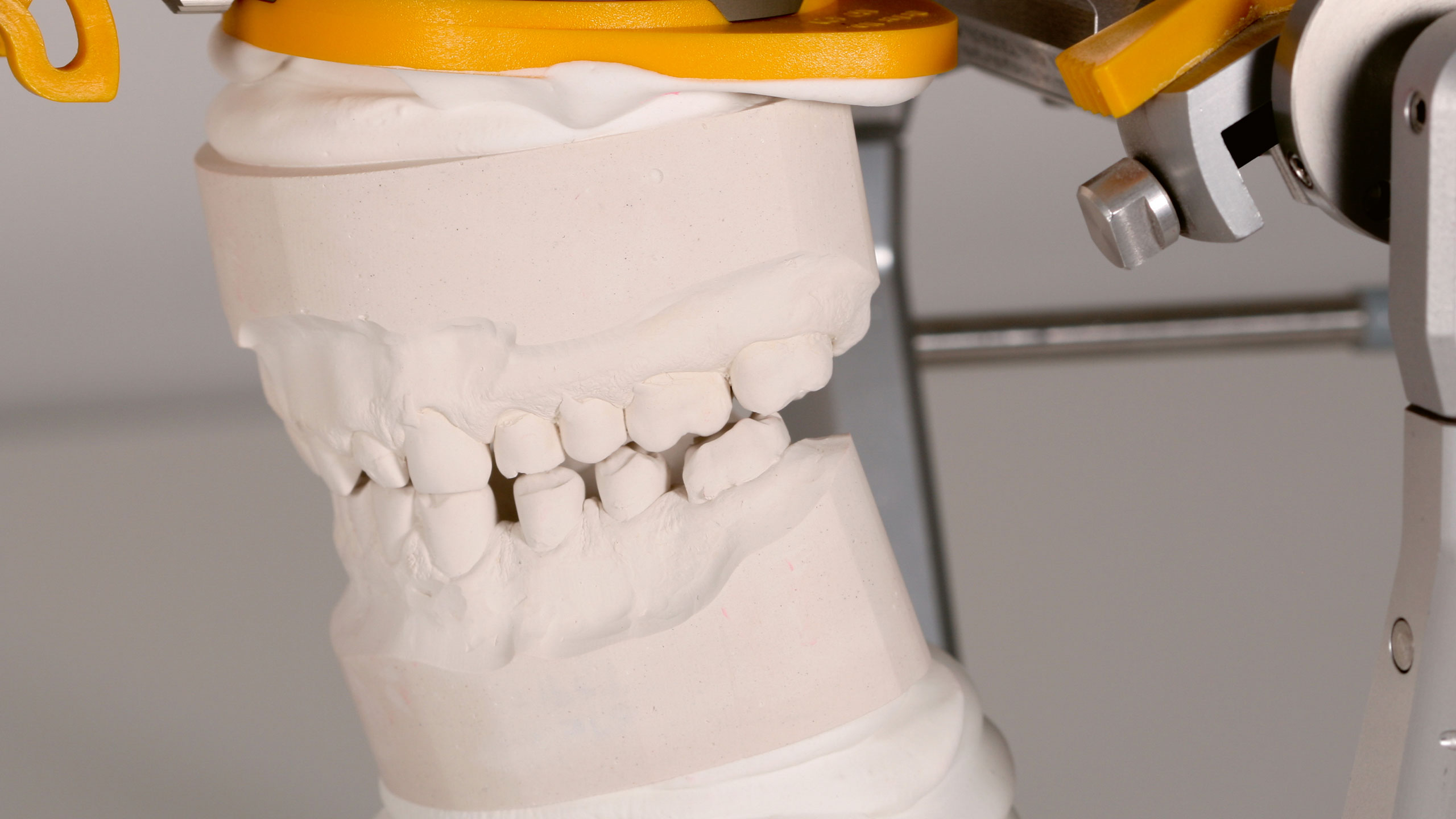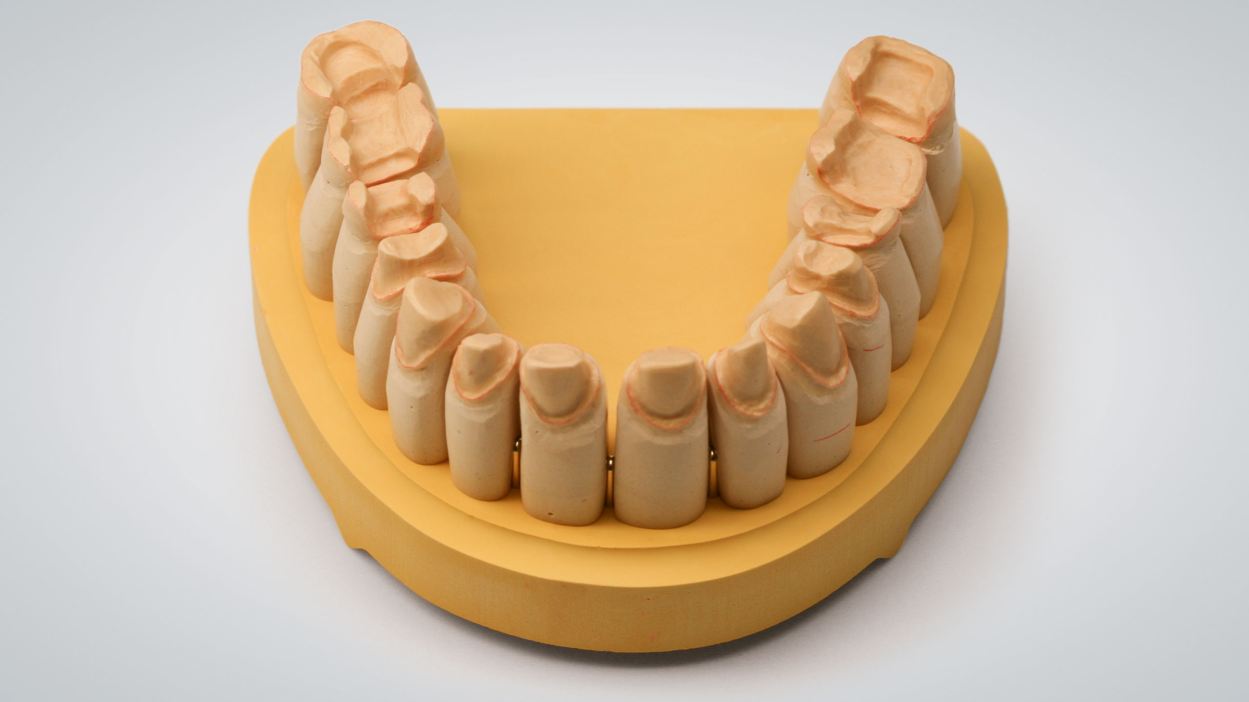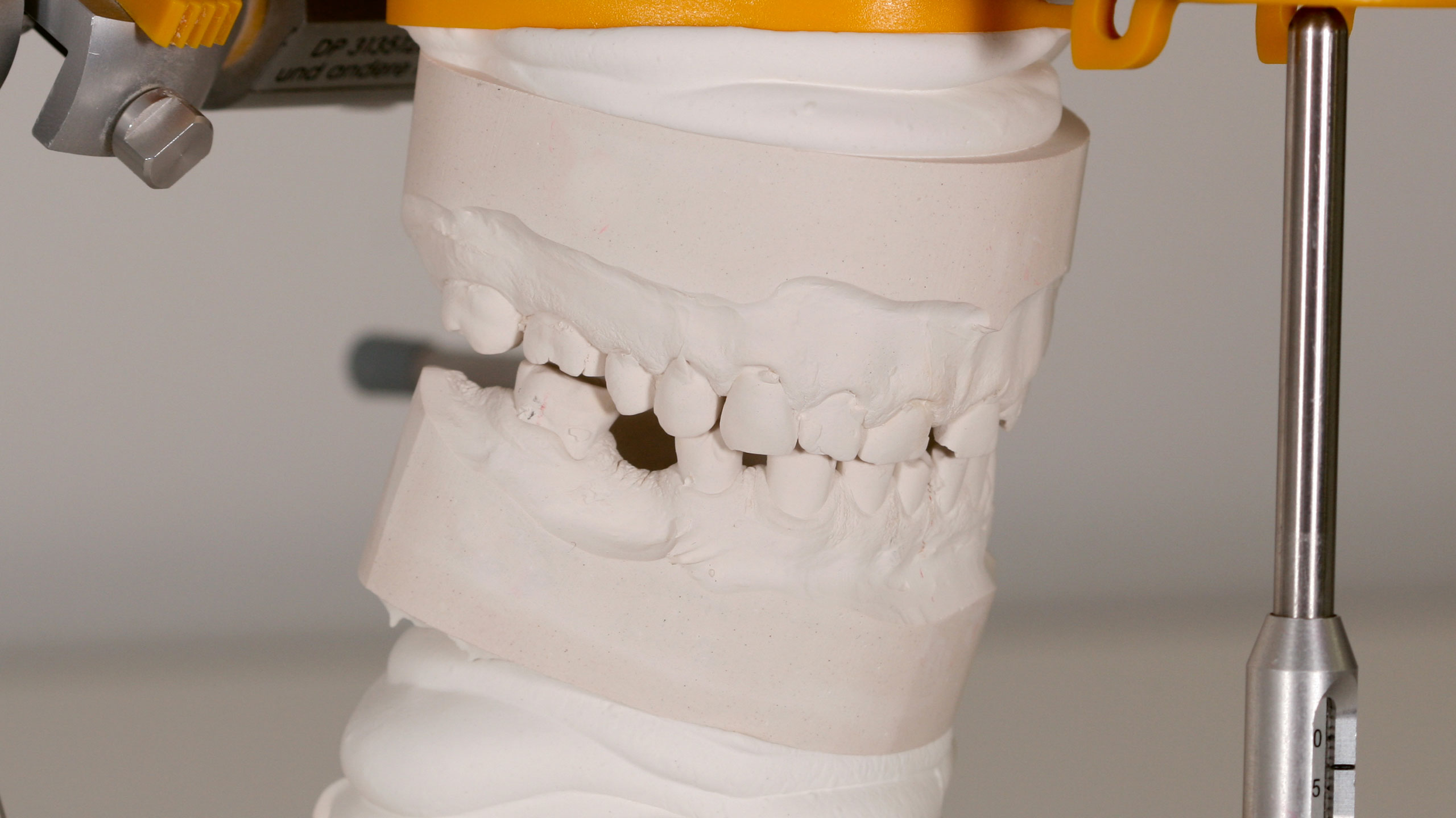 Um eine hohe Präzision zu erreichen und zu bewahren, benötigt man gute Materialen. Früher wiesen in unserem Labor die approximalen und okklusalen Kontaktpunkte immer mal wieder Präzisionsschwankungen auf. Infolgedessen betrieben wir intensive Ursachenforschung – in allen möglichen Bereichen. Diese Mühen wurden letztlich mehr als belohnt. Im Rahmen unserer Nachforschungen schafften wir uns ein Expansionsmessgerät für Gipse an. So fanden wir heraus, wie viel und wie lange manche Gipse nachexpandieren und wie stark diese Werte von den Herstellerangaben abweichen. Wir testeten viele Gipse und fanden bei Briegel Dental einen Gips, der sehr expansionsstabil ist, im richtigen Maß expandiert und sogar einen Expansionsstopp aufweist (EXS Rock, hellgrau). Für die Sockel verwenden wir Briegel Bioflow in Gelb, der ebenfalls sehr gute und vor allem konstant gute Werte aufweist (Abb. 27 bis 30). Wir testeten jede Charge aufs Neue und die beiden Gipse erwiesen sich als sehr zuverlässig. Beim Artikulationsgips setzen wir auf Artifix von Amann Girrbach. Da der vorliegende Patientenfall etwas zurückliegt, kam noch ein anderer Zahnkranzgips zum Einsatz.