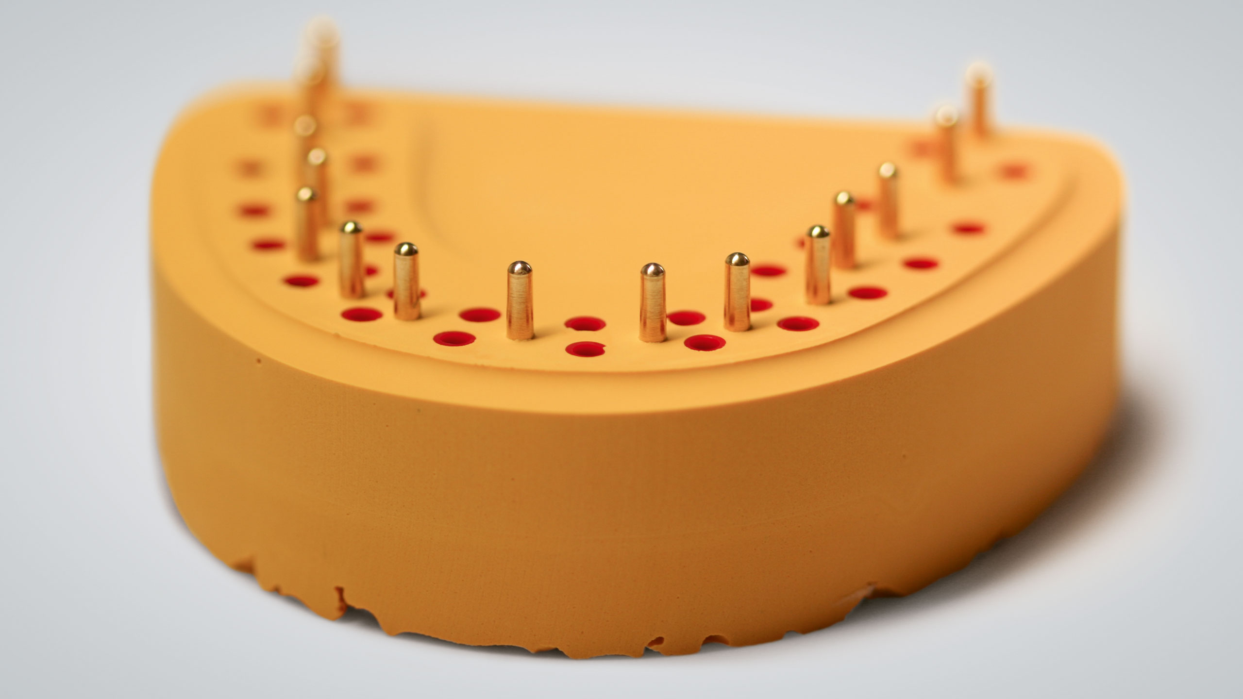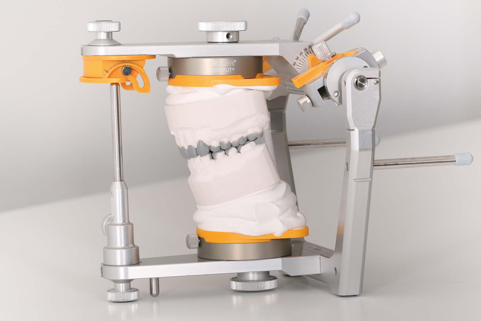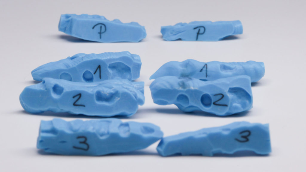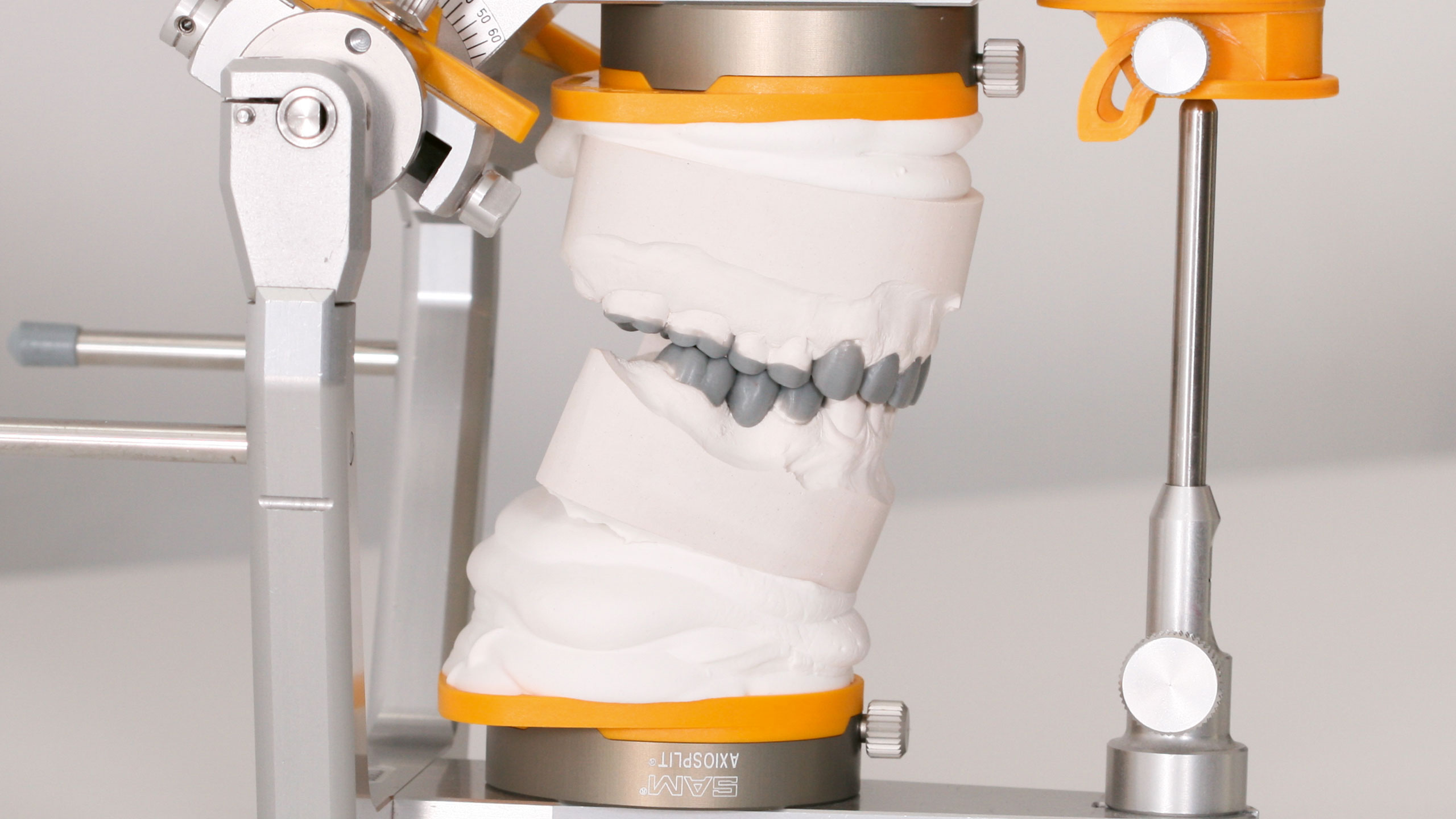 Um eine hohe Präzision zu erreichen und zu bewahren, benötigt man gute Materialen. Früher wiesen in unserem Labor die approximalen und okklusalen Kontaktpunkte immer mal wieder Präzisionsschwankungen auf. Infolgedessen betrieben wir intensive Ursachenforschung – in allen möglichen Bereichen. Diese Mühen wurden letztlich mehr als belohnt. Im Rahmen unserer Nachforschungen schafften wir uns ein Expansionsmessgerät für Gipse an. So fanden wir heraus, wie viel und wie lange manche Gipse nachexpandieren und wie stark diese Werte von den Herstellerangaben abweichen. Wir testeten viele Gipse und fanden bei Briegel Dental einen Gips, der sehr expansionsstabil ist, im richtigen Maß expandiert und sogar einen Expansionsstopp aufweist (EXS Rock, hellgrau). Für die Sockel verwenden wir Briegel Bioflow in Gelb, der ebenfalls sehr gute und vor allem konstant gute Werte aufweist (Abb. 27 bis 30). Wir testeten jede Charge aufs Neue und die beiden Gipse erwiesen sich als sehr zuverlässig. Beim Artikulationsgips setzen wir auf Artifix von Amann Girrbach. Da der vorliegende Patientenfall etwas zurückliegt, kam noch ein anderer Zahnkranzgips zum Einsatz.