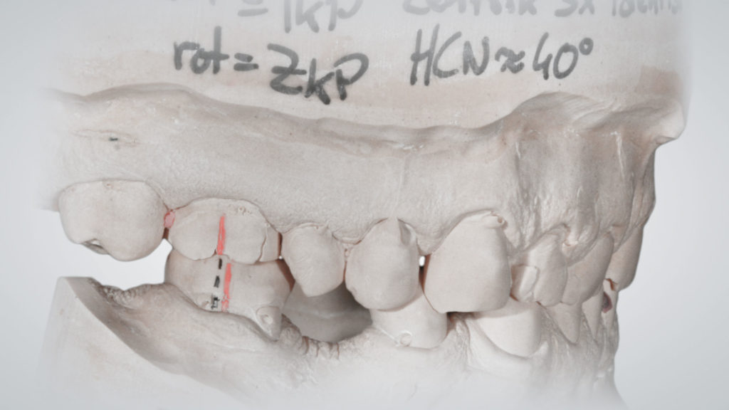 Unter Zuhilfenahme des Protrusionsregistrats konnten wir den Horizontalen Condylenbahnneigungswinkel (HCN) ermitteln und den Artikulator entsprechend programmieren. Diesen Wert notierten wir uns als Information für die spätere definitive Arbeit. Im nächsten Schritt wurde die zentrische mit der habituellen Bisslage verglichen. Dazu orientierten wir uns an den bukkalen Markierungen auf dem Modell. Der Unterkiefer sollte in Fällen wie diesem in der Zentrik bilateral nicht mehr als circa 1 mm retral liegen, wenn man ohne Schienentherapie fortfahren möchte. Bei größeren Abweichungen oder funktionellen Problemen ist es sinnvoll, sich an diesem Punkt mit einer vorherigen Schienentherapie abzusichern, um dem Kiefergelenk und dem gesamten Kauapparat Zeit zu geben, sich neu auszurichten. In diesem Fall betrug der ­sagittale Versatz auf beiden Seiten nur etwa 1 mm, weshalb wir direkt mit dem Wax-up fortfahren konnten (Abb. 12).