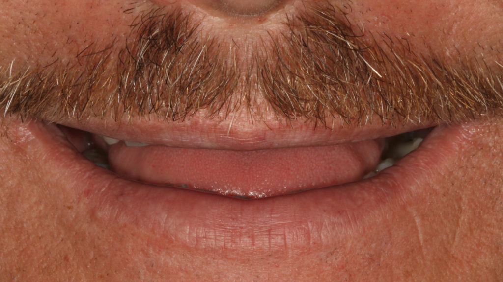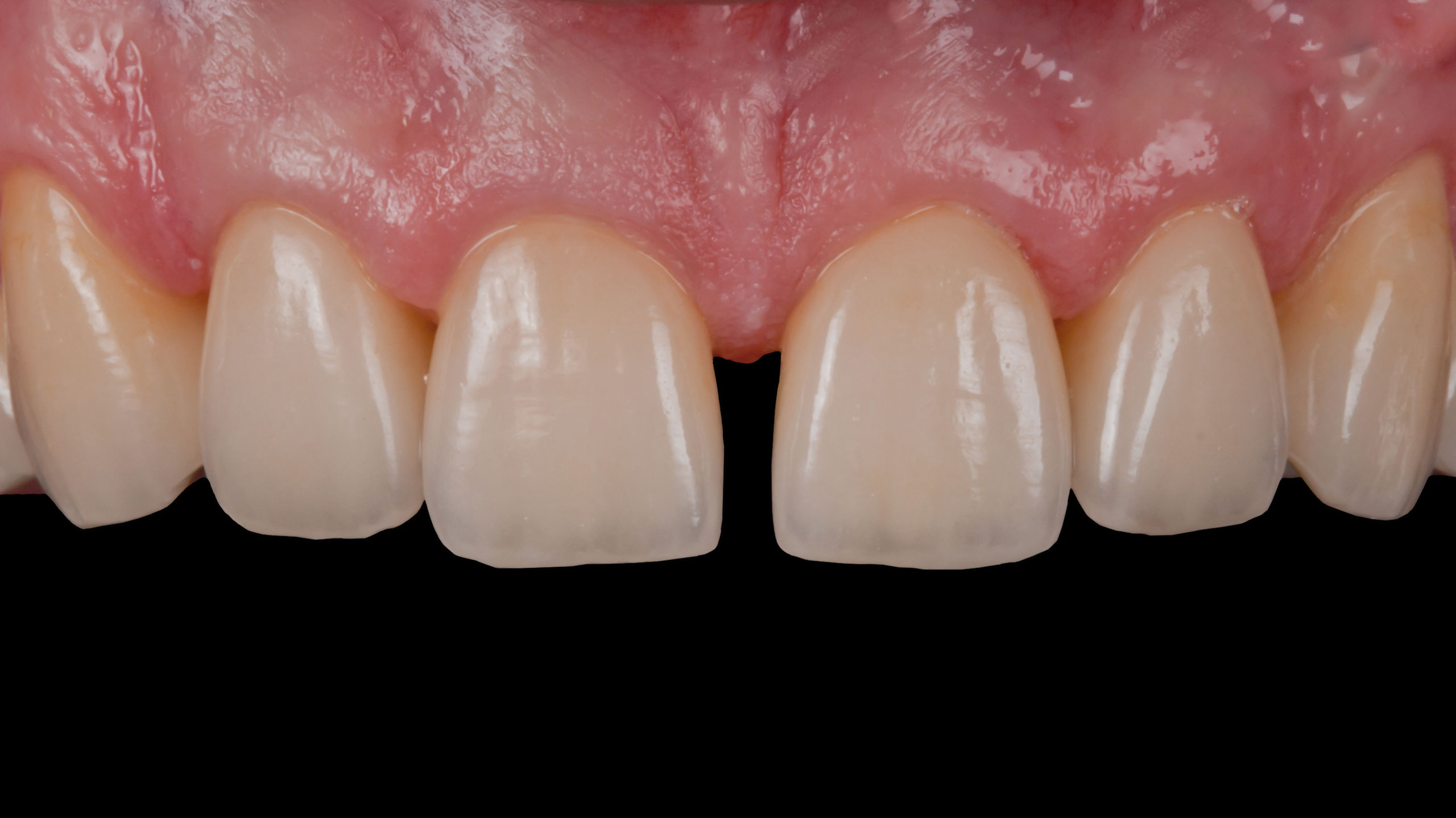 Nach dem Entfernen der Langzeitprovisorien (Abb. 43 und 44) konnten die Vollkeramikteilkronen im Seitenzahngebiet unter absoluter Trockenlegung mittels Kofferdamm und Adhäsivtechnik eingeklebt werden (Abb. 45 bis 49). Die Kronen und Veneers im Frontzahnbereich wurden unter relativer Trockenlegung mit Retraktionsfäden – ebenfalls adhäsiv – eingesetzt (Abb. 50 bis 56). Im Allgemeinen ist zu beachten, dass Vollkeramikkronen aus Feldspatkeramik (regio 13 bis 23) prinzipiell immer mit einem Volladhäsivsystem befestigt werden müssen. Nur so kann eine ausreichende Stabilität gewährleistet werden. Wir verwenden dazu Panavia. Die Abbildungen 3 bis 56 sollen nochmals die Dimensionen verdeutlichen, die wir restaurativ überbrückt haben. Um ein solch großes Vorhaben wie die Rekonstruktion eines derart massiven Verlusts der VDO zum Erfolg zu führen (Abb. 57 bis 60), braucht man Partner auf Augenhöhe. Partner, die ihr Handwerk verstehen, im Team denken und kommunikativ sind. Ich habe das große Glück und bin sehr dankbar, dass dies auf alle Zahnärzte, mit denen wir zusammenarbeiten, zutrifft. Wir pflegen eine Kultur des gegenseitigen Respekts und der gegenseitigen Wertschätzung. Den präsentierten Fall habe ich zusammen mit meinem Bruder, Dr. Matthias Lange, durchgeführt.