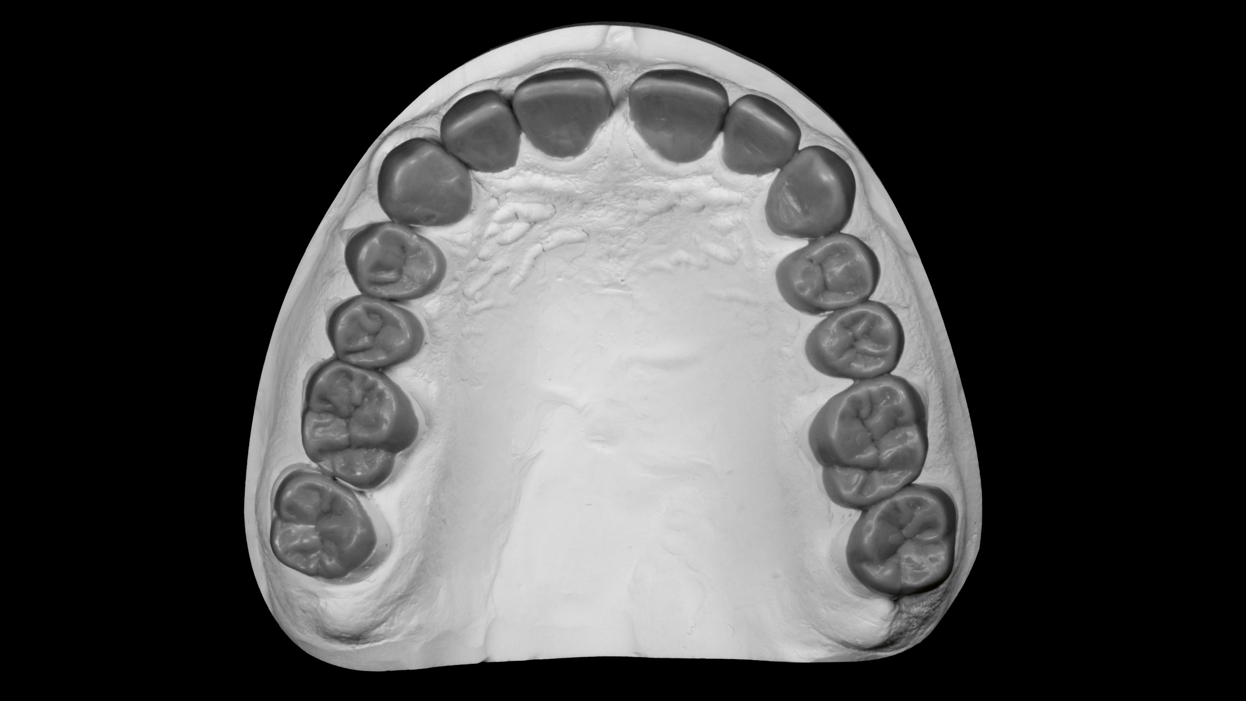 In diesem Fall entschied sich der Patient dazu, sein Diastema zu behalten, da es optisch seinem Typ entsprach. Wir konnten ihn in dieser Meinung nur bestätigen. Die Patientenfotos wurden am Computer in einer adäquaten Software über Hilfslinien so platziert, dass die Mittelachse zum Gesicht optimal ausgerichtet war und auf das Modell übertragen werden konnte. Mithilfe der Lippenbilder erhielten wir wertvolle Informationen über die passende Länge der Frontzähne und den Schneidekantenverlauf. Als Nächstes wurde ein diagnostisches Wax-up erstellt. In Fällen wie diesen benutzen wir gerne dunkles Wachs auf hellem Gips. Dadurch können wir später genau erkennen, welche Bereiche der Behandler bei der Präparation mit einbeziehen sollte, um unsere im Wax-up erarbeitete Zielsituation ästhetisch und funktionell umsetzen zu können (Abb. 15 bis 18). Um die mittels Wax-up erarbeiten Informationen zu schützen, dublierten wir das aufgewachste Modell. Auf diesen Duplikatmodellen wurden anschließend Silikonschlüssel für die Präparation hergestellt, um die Zähne später gezielt beschleifen zu können.