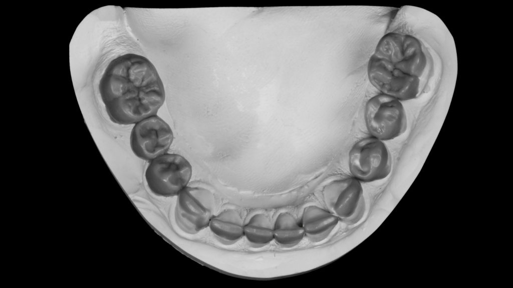 Im Labor wurden die Modelle mit einem Split-Cast-Sockel versehen und mit dem Gesichtsbogen sowie dem Zentrikregistrat Nummer 1 einartikuliert. Danach wurde die einartikulierte Situation mithilfe einer Split-Cast-Kontrolle mit dem 2. und 3. Zentrik­biss verglichen. Nur wenn alle drei Registrate zu einem identischen „Biss“ führen, können wir uns sicher sein, dass wir uns innerhalb der Zentrik befinden. Treten bei diesem Schritt Unstimmigkeiten auf, sollte die Zentrikbissnahme wiederholt und gegebenenfalls ein Zwischenschritt in Form einer Schienentherapie eingeplant werden. In unserem Fall waren alle drei Zentrikregistrate identisch, weshalb wir unsere Arbeit anhand der korrekt einartikulierten Modelle einfach fortsetzen konnten (Abb. 10 und 11).
