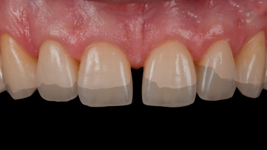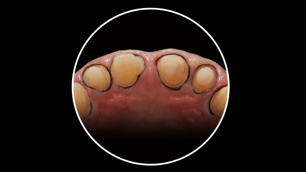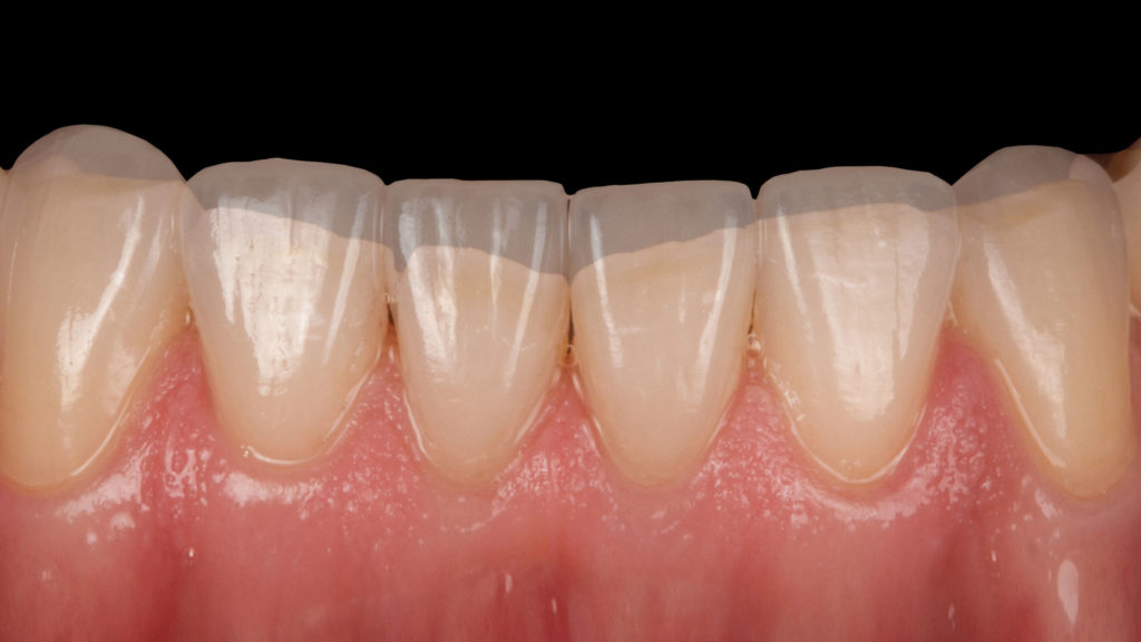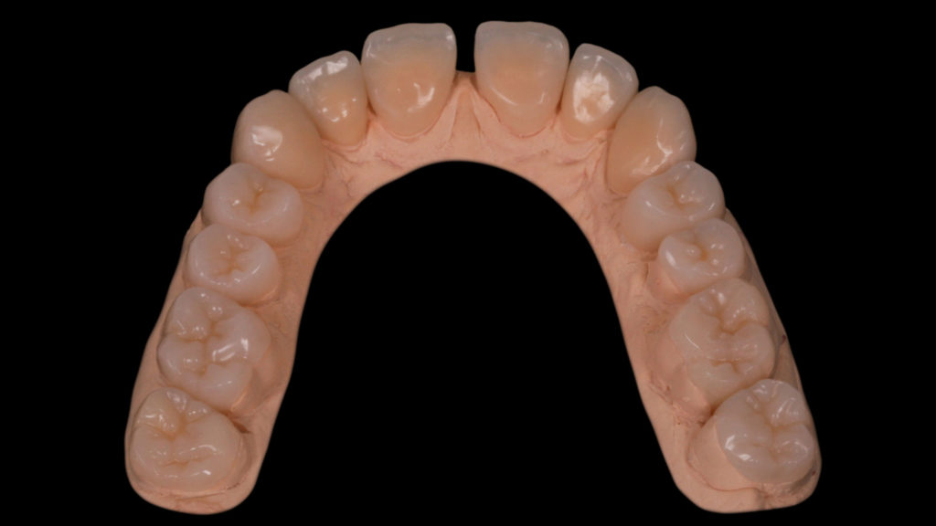 Für uns ist es elementar wichtig, dass der Patient bei komplexen Versorgungen wie dieser die angestrebte Wax-up Zielsituation im Mund probetragen kann. Das bringt große Sicherheit und garantiert ein vorhersagbares Ergebnis. Denn nirgendwo lässt sich ein angestrebtes prothetisches Ergebnis besser kontrollieren als im Patientenmund. Um das Wax-up in den Patientenmund zu übertragen gibt es je nach Situation verschiedene Möglichkeiten. Oft fertigen wir vor der Präparation glasklare Silikonvorwälle über dem Wax-up und der Behandler spritzt durch kleine, in diesen Vorwällen angebrachte Bohrungen Komposit auf die Zähne. Das ist kostengünstig und nicht besonders aufwendig. Alternativ kann auch das Wax-up eingescannt und CAD/CAM-gestützt ein Langzeitprovisorium hergestellt werden.