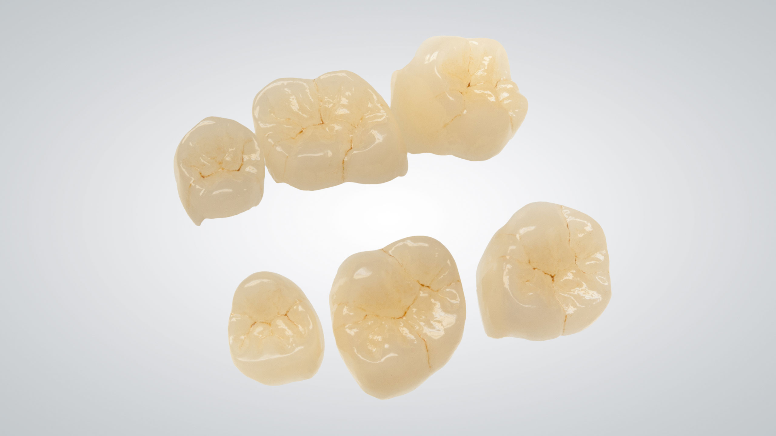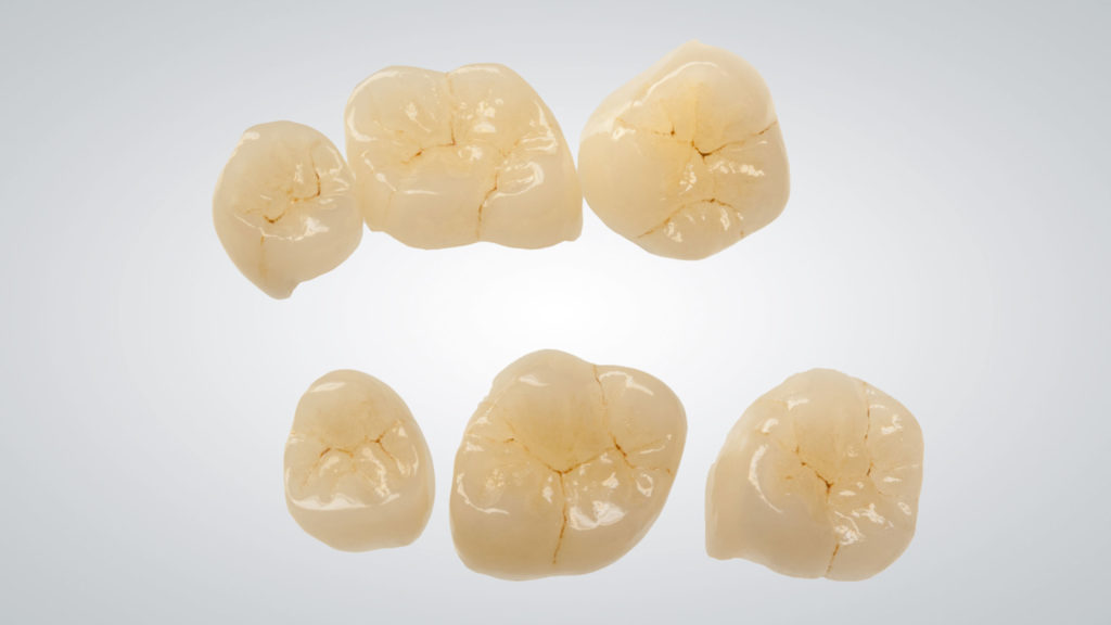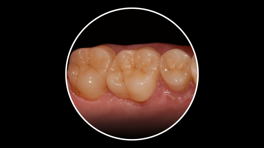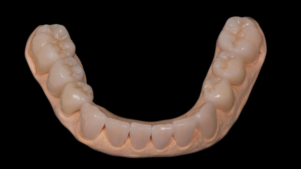 Wir entscheiden bei jedem Fall individuell, welches Restaurationsmaterial für die jeweilige Situation die besten optischen und funktionellen Eigenschaften besitzt. In diesem Fall entschieden wir uns bei den Teilkronen im Seitenzahngebiet für händisch aufgewachste und dann in Presskeramik überführte Restaurationen (Abb. 31 bis 37). Bei dem Abutment regio 45 handelt es sich um ein Hybridabutment, also einen Zirkonoxidaufbau auf einer Titanklebebasis. Zum Zeitpunkt der Herstellung dieser Arbeit haben wir für die Anfertigung der Vollkeramikkronen im Seitenzahnbereich noch Zirkonoxidgerüste vollverblendet (Abb. 38). Inzwischen würden wir, aufgrund der leicht unterschiedlichen farblichen Wirkung, dafür ebenfalls Presskeramikkronen bemalen.