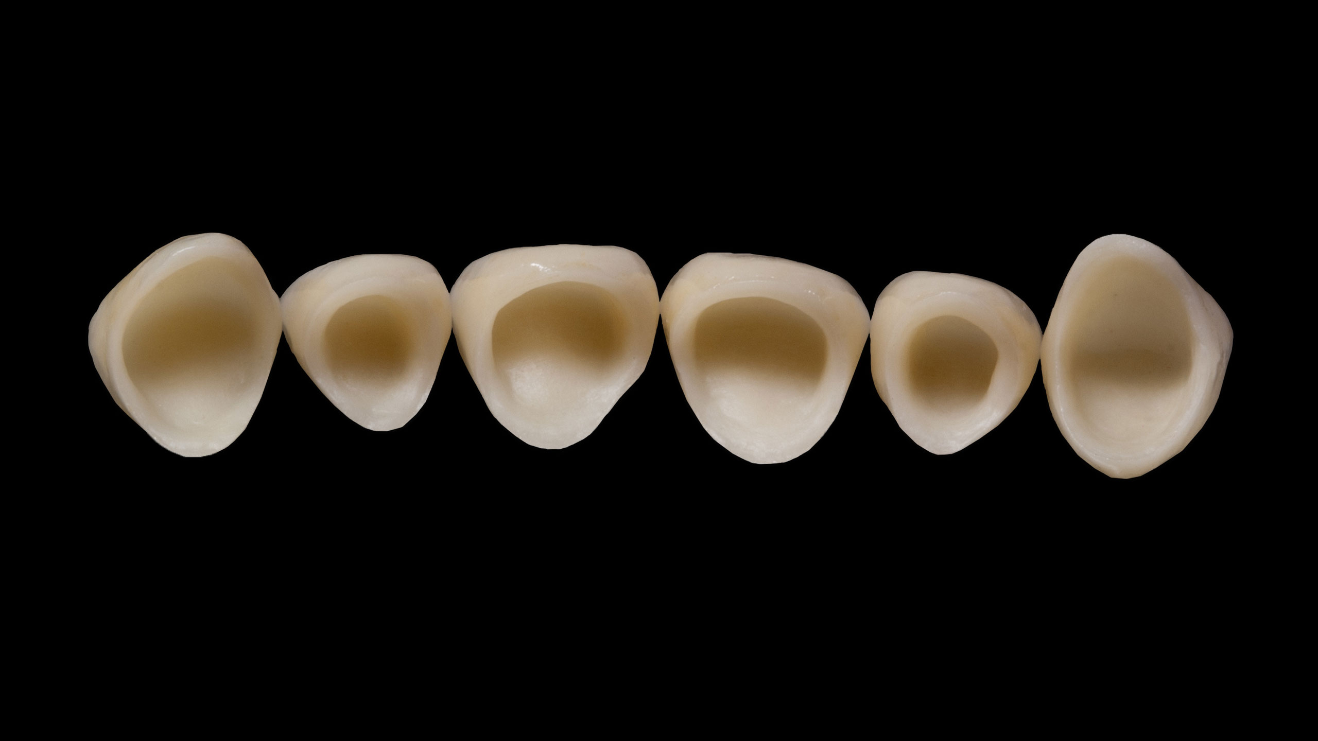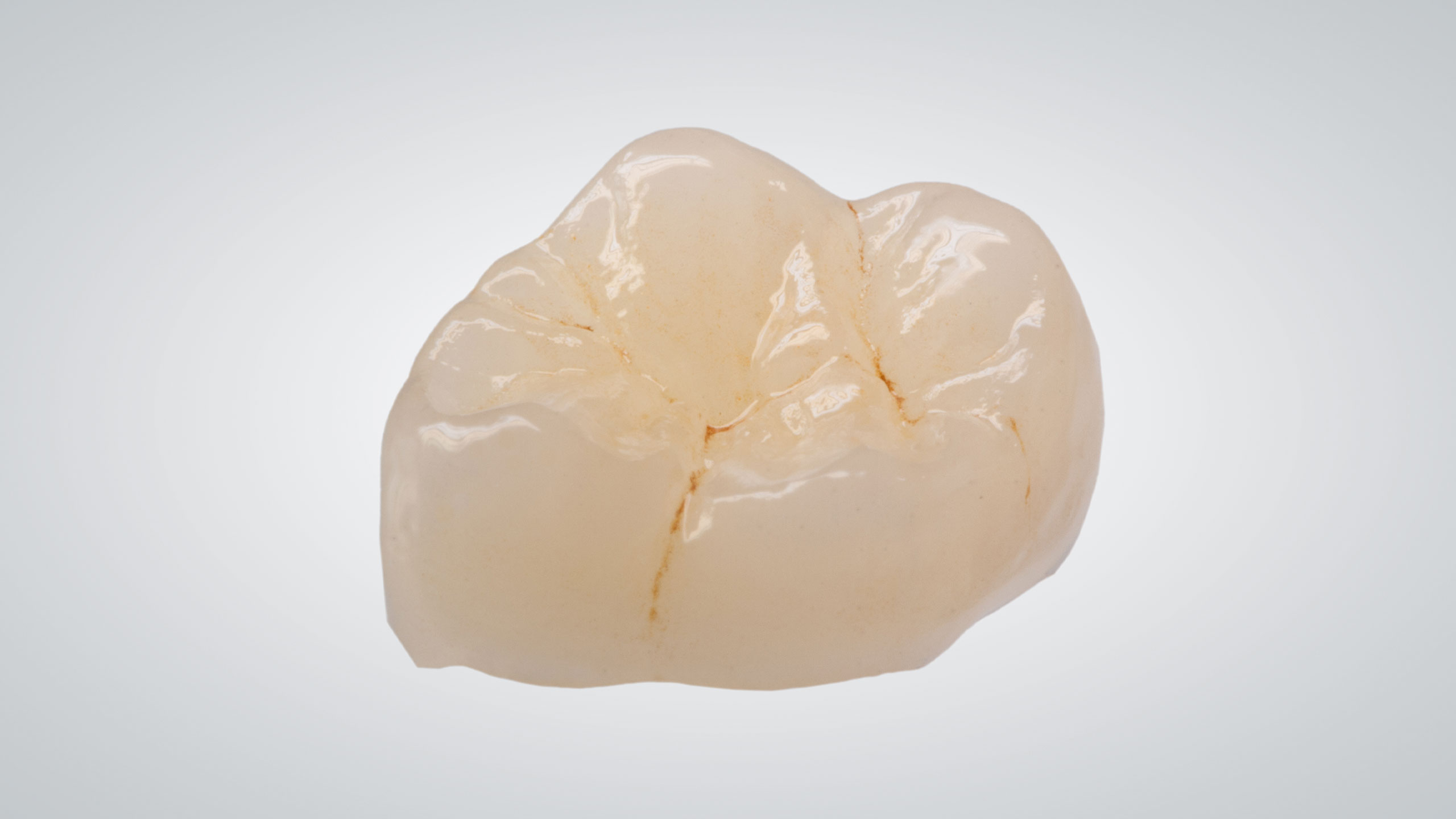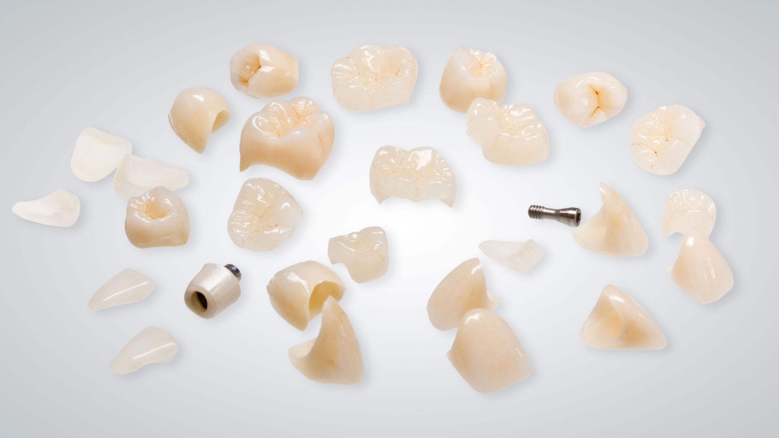 Wir entscheiden bei jedem Fall individuell, welches Restaurationsmaterial für die jeweilige Situation die besten optischen und funktionellen Eigenschaften besitzt. In diesem Fall entschieden wir uns bei den Teilkronen im Seitenzahngebiet für händisch aufgewachste und dann in Presskeramik überführte Restaurationen (Abb. 31 bis 37). Bei dem Abutment regio 45 handelt es sich um ein Hybridabutment, also einen Zirkonoxidaufbau auf einer Titanklebebasis. Zum Zeitpunkt der Herstellung dieser Arbeit haben wir für die Anfertigung der Vollkeramikkronen im Seitenzahnbereich noch Zirkonoxidgerüste vollverblendet (Abb. 38). Inzwischen würden wir, aufgrund der leicht unterschiedlichen farblichen Wirkung, dafür ebenfalls Presskeramikkronen bemalen.