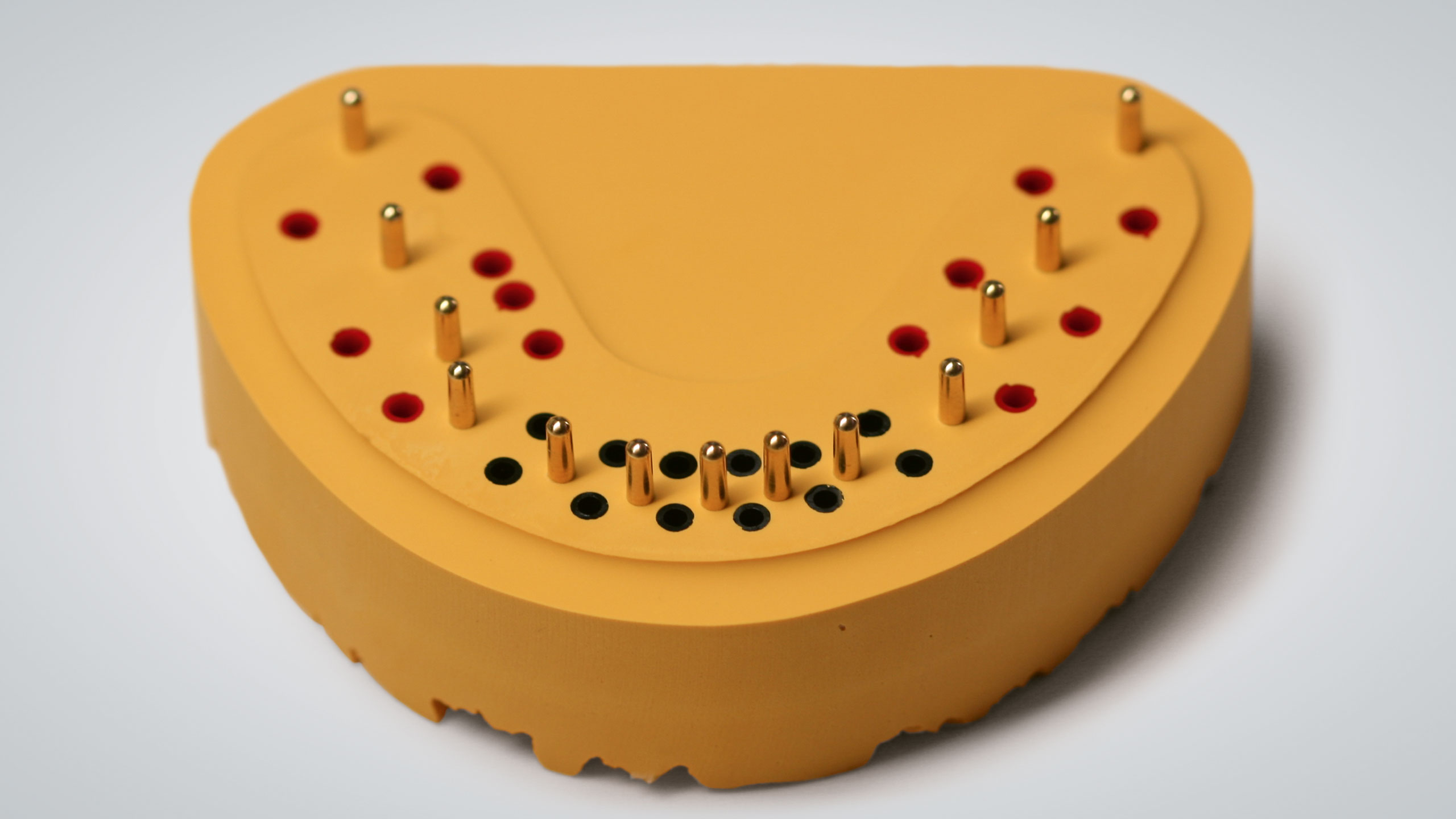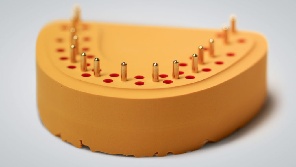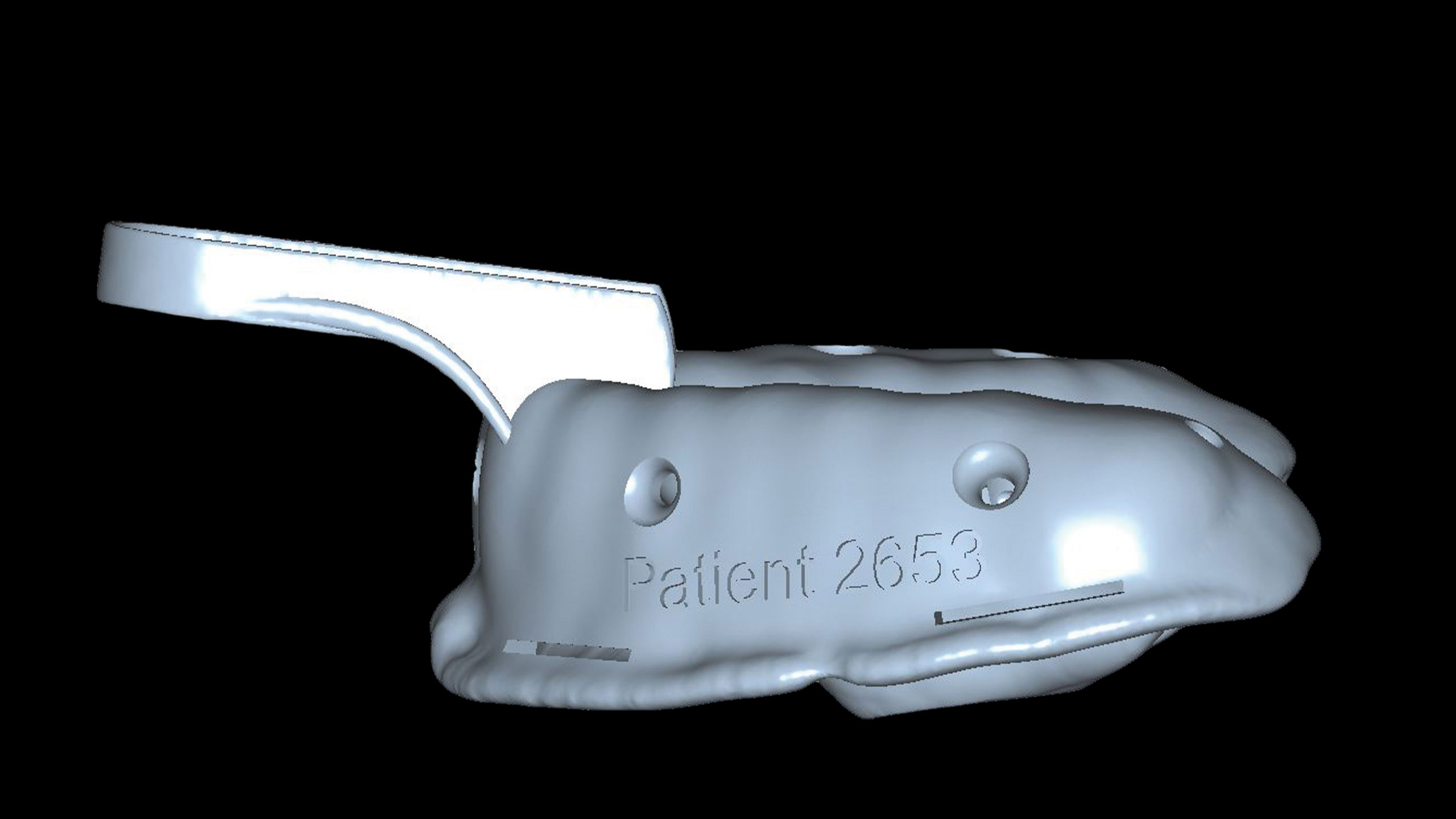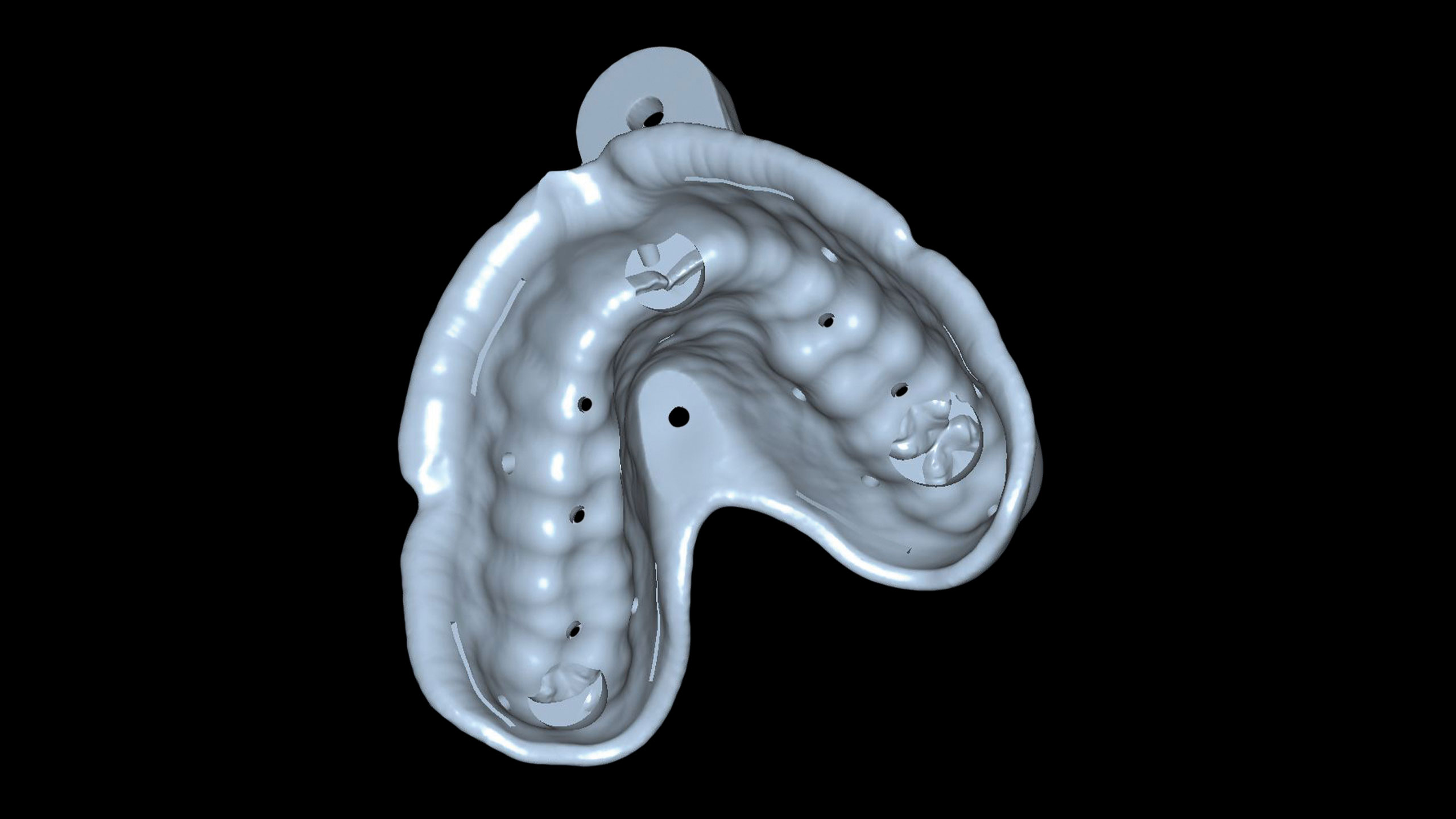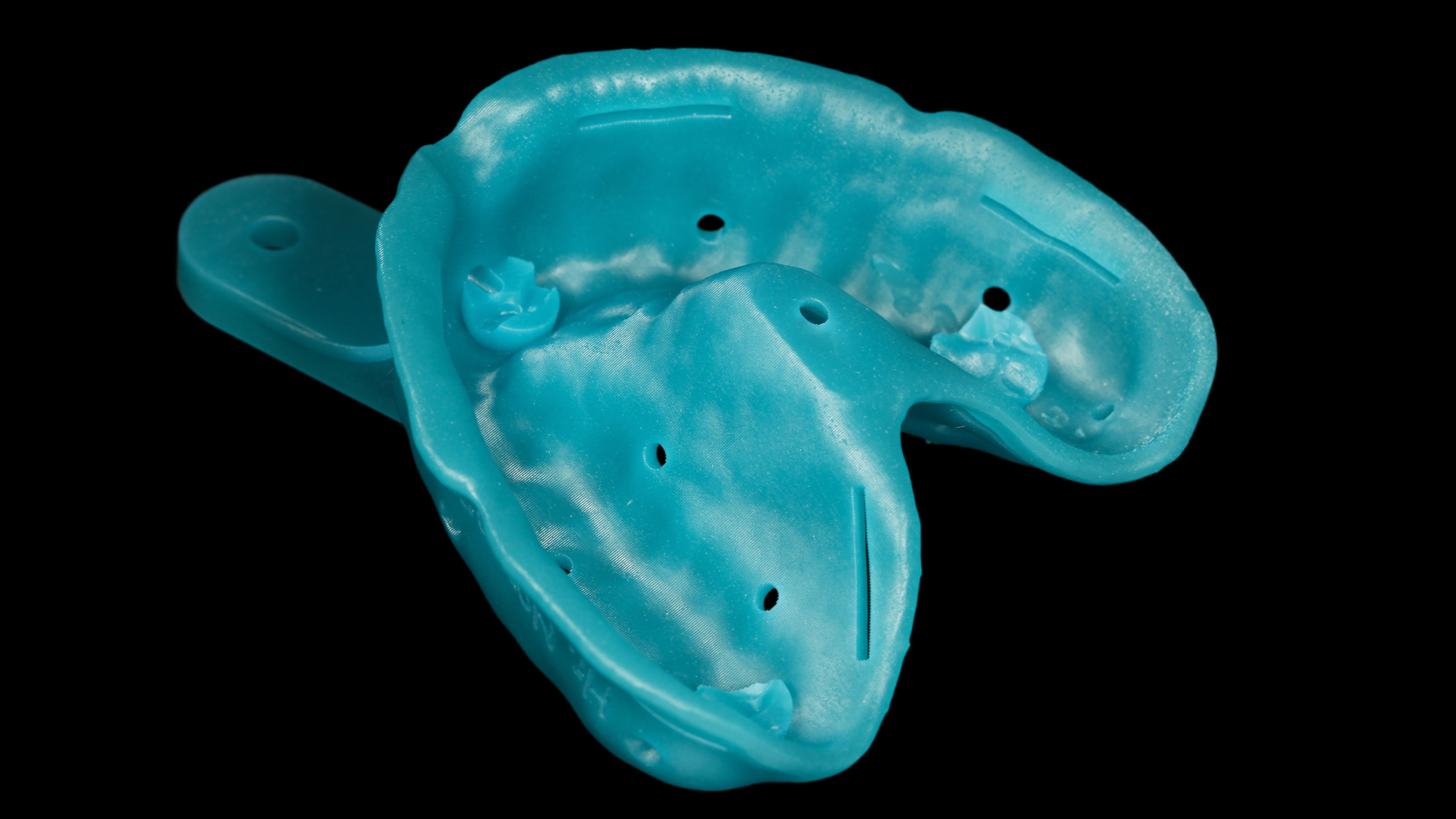Als zweiter, sehr wichtiger Punkt erwies sich das Design der individuellen Löffel, das optimiert werden musste. Okklusale Stopps gewährleisten eine gleichmäßige Materialstärke des Abformmaterials und der Löffel wird während der Aushärtephase desselben gegen Verwackeln geschützt, da er okklusal fixiert ist. Die individuellen Löffel können im CAD-Design entworfen und mit dem 3-D-Drucker gedruckt werden (vgl. Abb. 24 bis 26).