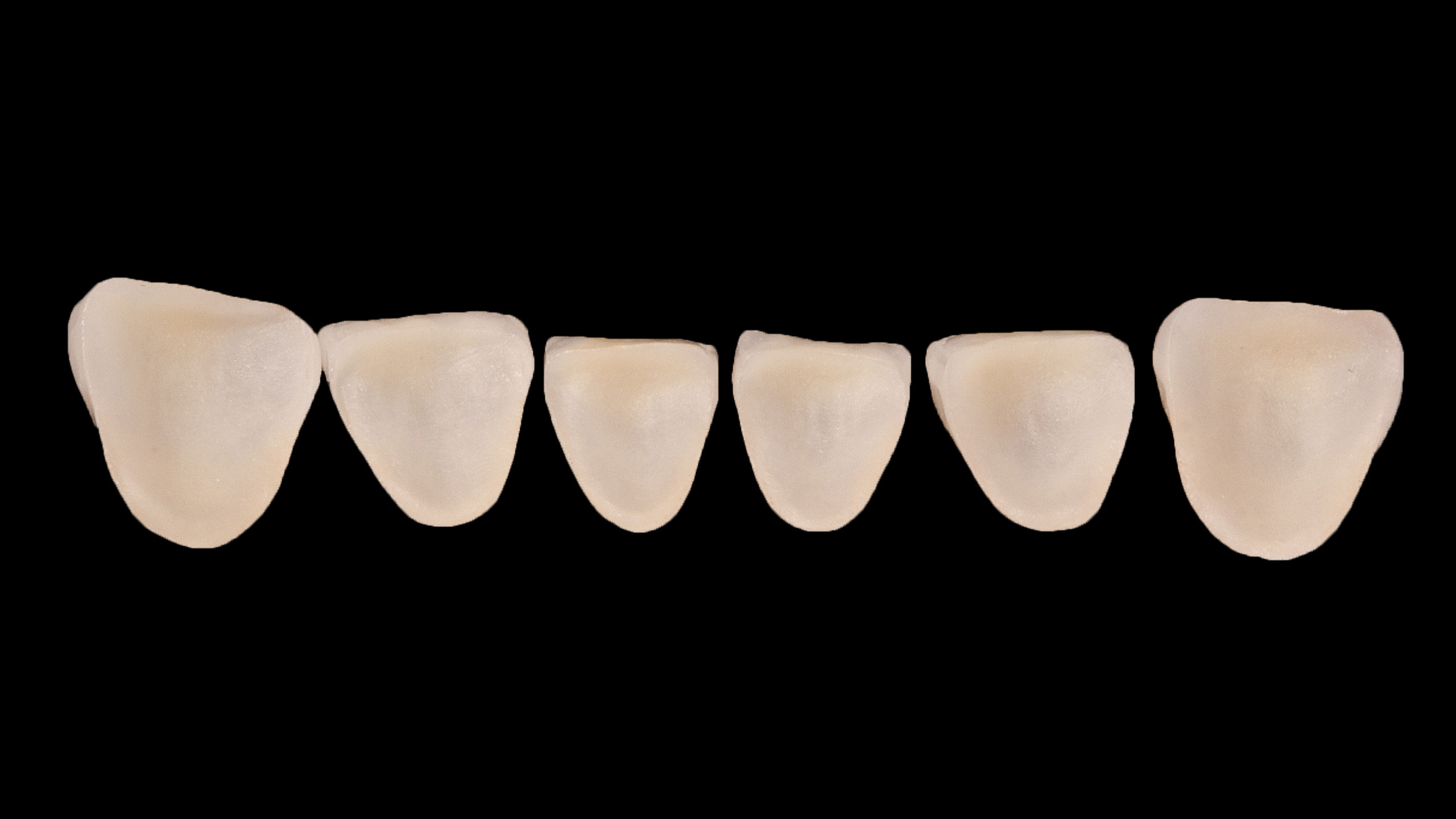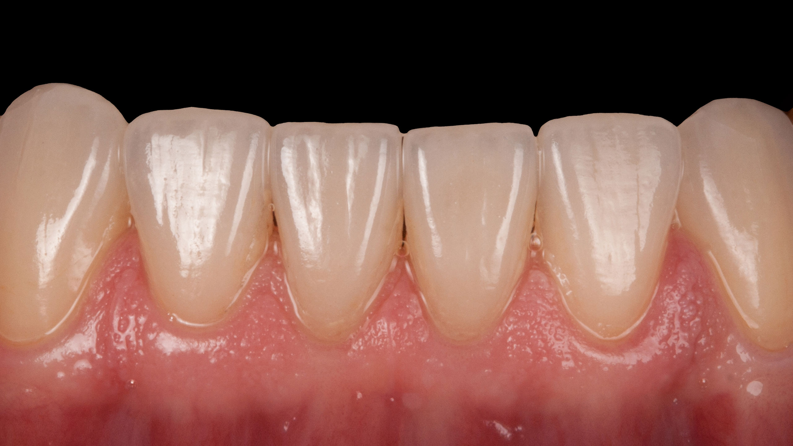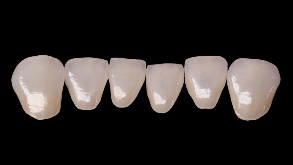 Die Frontzahnversorgungen wurden alle aus Feldspatkeramik hergestellt und adhäsiv verklebt. Konkret wurden die Dentinkerne der Vollkeramikkronen von 13 auf 23 mit einem Creation CP Pellet gepresst (Abb. 39) und mit Willi Geller Creation CC vollverblendet (Abb. 40). Bei Willi Geller Creation CP handelt es sich um einen Dentin-Pressrohling aus Feldspatkeramik, der bei 1050°C gepresst wird und mit einer hochschmelzenden Keramik verblendet werden kann. Für uns brachte das den Vorteil, dass wir alle Vollkeramikteile im Frontzahnbereich, egal ob Veneer oder Vollkeramikkrone, mit derselben Verblendkeramik ästhetisch finalisieren konnten. Die lichtoptischen Eigenschaften und die Haltbarkeit dieser Keramik – immer unter der Voraussetzung der adhäsiven Befestigung – begeistern uns noch immer. Im Unterkiefer wurden auf feuerfesten Stümpfen individuell geschichtete Veneers hergestellt, ebenfalls mit Willi Geller Creation CC (Abb. 41 und 42). Die großen Lücken zwischen den Unterkieferseitenzähnen konnten nur mithilfe einer geschickt gewählten Zahnform geschlossen und ohne KFO realisiert werden.