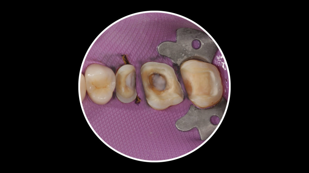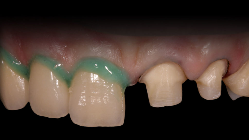 In diesem Fall gingen wir nach erfolgter Präparation den Weg über ein konventionelles Langzeitprovisorium. In Abbildung 19 ist die verbliebene Zahnsubstanz nach dem Präparieren und Entfernen der Füllungen zu sehen. Der Aufbau sowie die erneute Präparation der Pfeiler sind den Abbildungen 20 und 21 zu entnehmen. Mit dem anschließend hergestellten Langzeitprovisorium (Abb. 22 und 23) konnte der Patient in aller Ruhe testen, wie er mit der neuen Situation, seinen neuen Zähnen zurechtkommt. Funktionelle und ästhetische Änderungen sind während dieser Phase jederzeit möglich. In dieser Zeit wurde auch das Implantat in regio 35 inseriert. Nach einer Tragedauer von mindestens zwei bis drei Monaten, eventuellen Anpassungen und positiver Annahme durch den Patienten geht es an die definitive Umsetzung in Keramik.