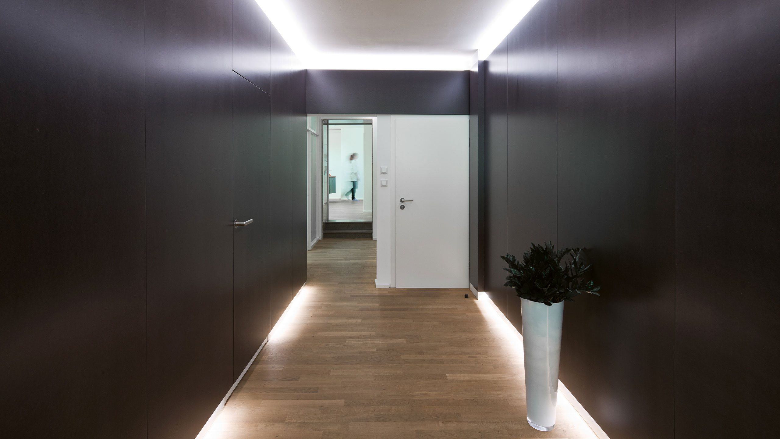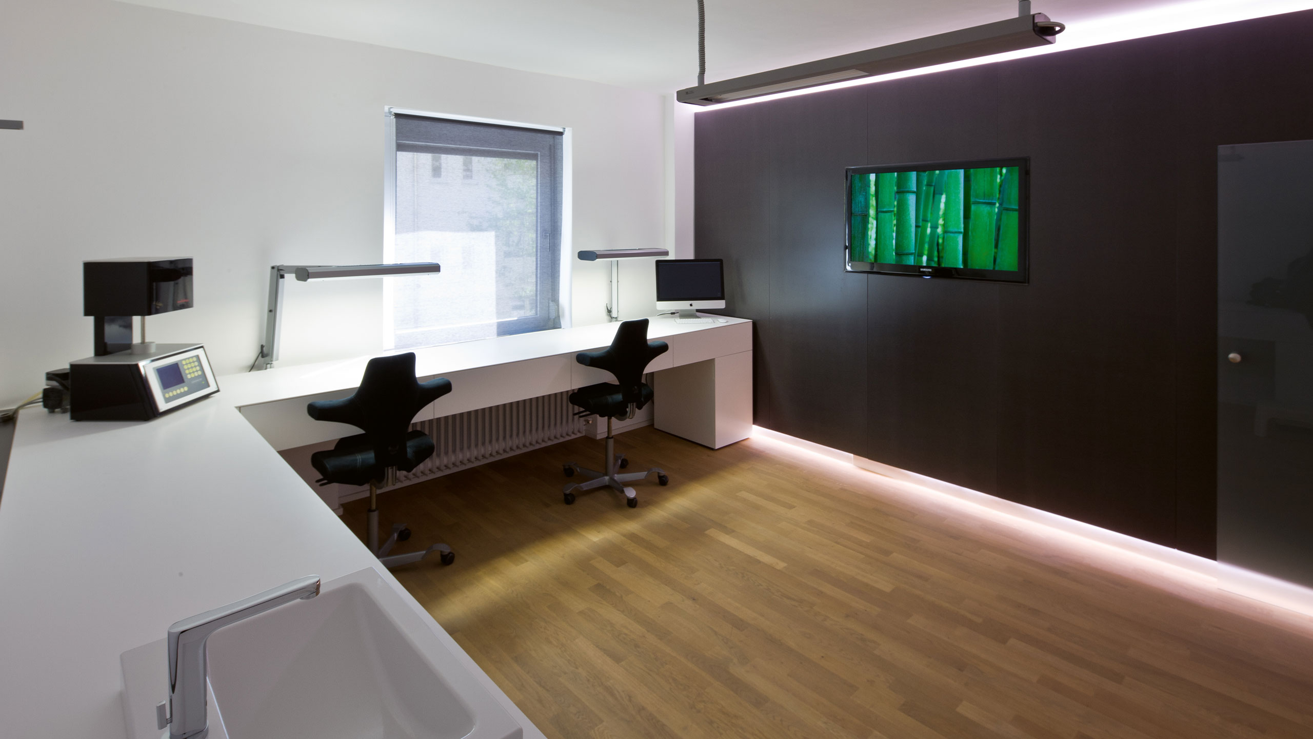 Zum Schluss möchte ich noch auf einen anderen, aus meiner Sicht sehr wichtigen Aspekt unseres Tuns hinweisen: unser Arbeitsumfeld. Ein ästhetisches und auch für Besucher ansprechendes Ambiente ist mir sehr wichtig, denn man möchte gerne wiederkommen. Wir sind Produzenten und Zulieferer prothetischer Teile und arbeiten Hand in Hand mit unseren Zahnärzten. Daher sollten auch unsere Räumlichkeiten entsprechend gestaltet sein (Abb. 61 bis 63).