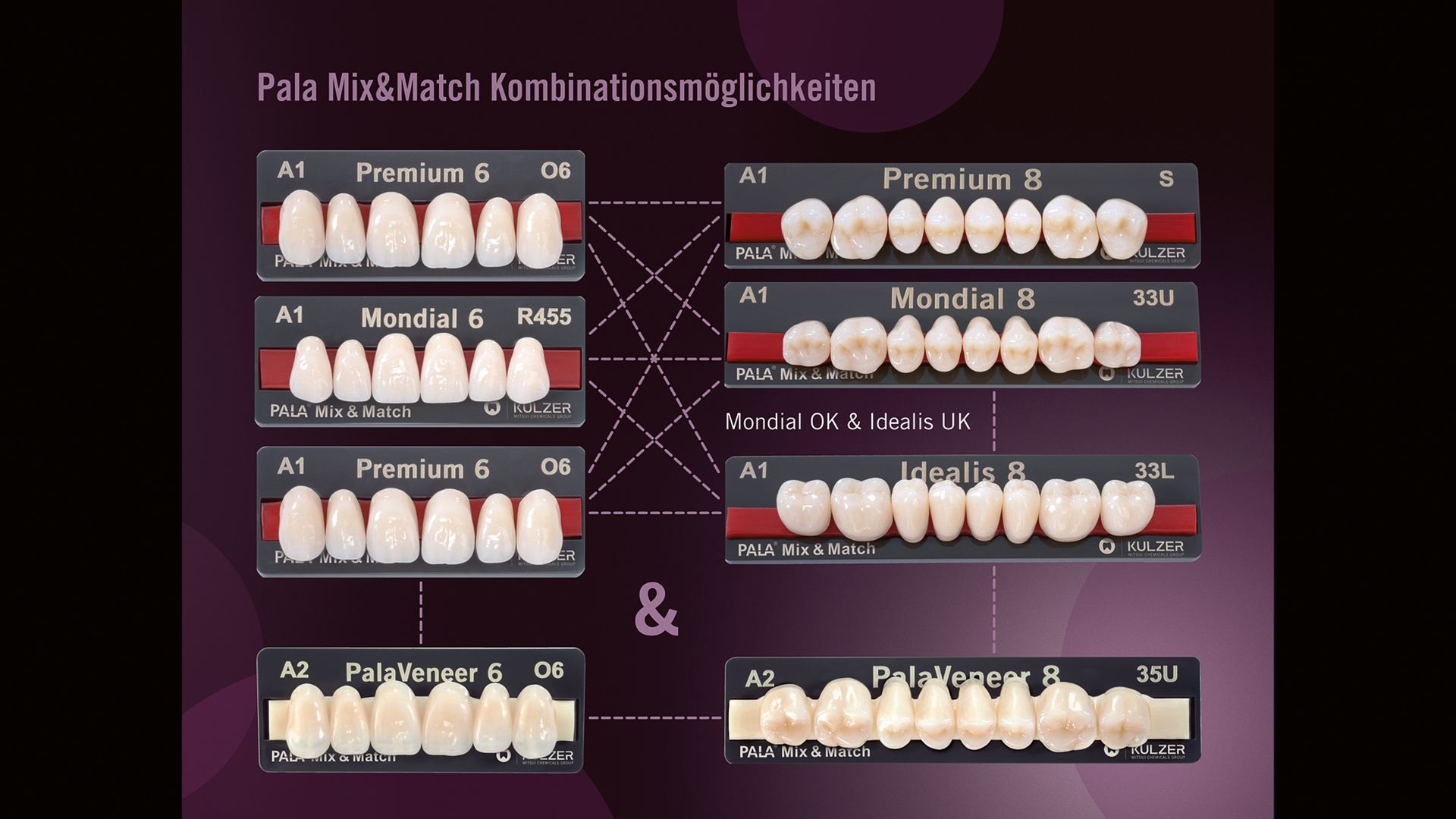 In verschiedenen Konzepten sowie in Kombination Mondial im Oberkiefer mit Idealis im Unterkiefer aufstellbar