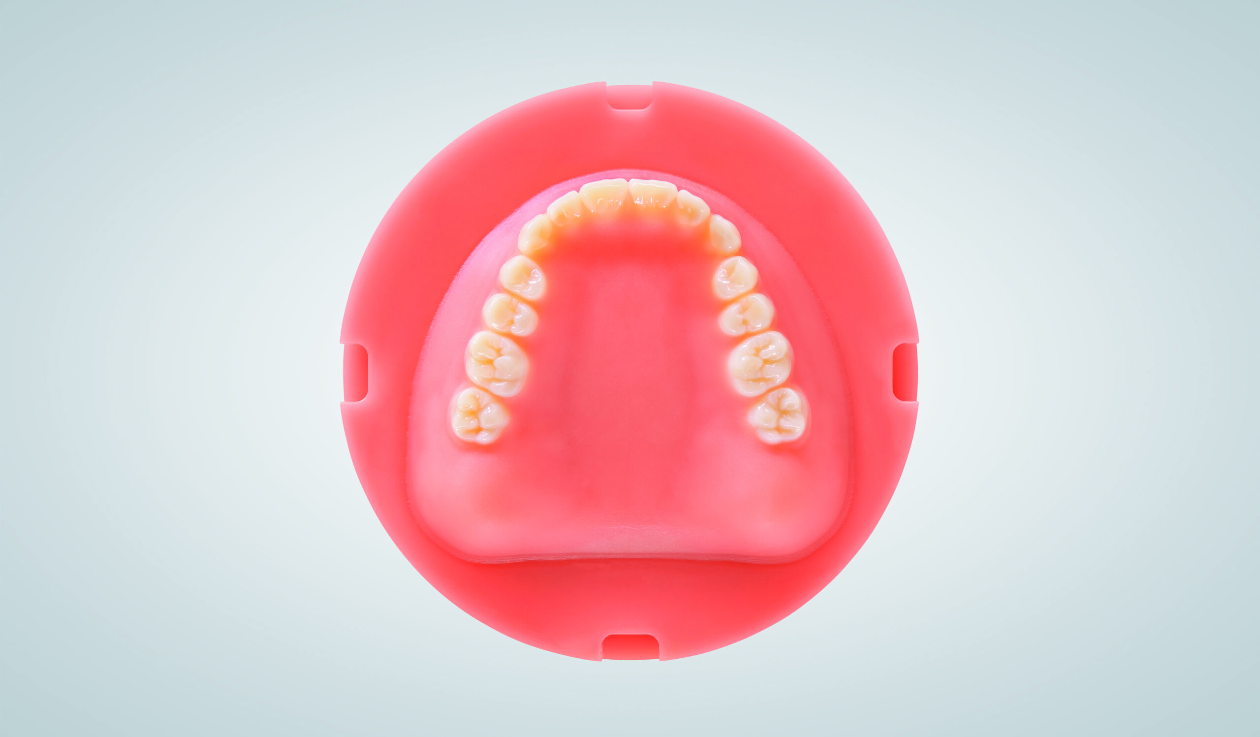 Totalprothesenrohling aus High Impact PMMA oder OMP-N PMMA, mit integrierten Zahnreihen / Kein Einkleben – mehrschichtige Konfektionszähne sind bereits einpolymerisiert / Lingualisierte Okklusion | Zahn-zu-Zahn- Beziehung | Unilaterale Abstützung / Restmonomergehalt 1% / Made in Germany| Medizinprodukt der Klasse IIa
