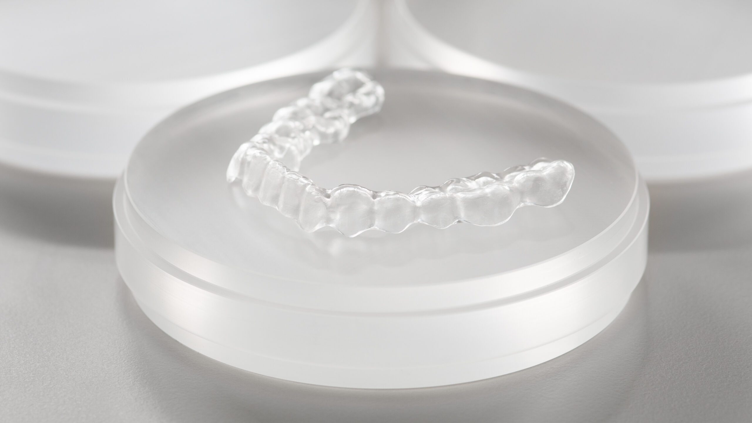 Gefräste Aufbissschiene mit sehr hohem Tragekomfort dank thermoplastischer Flexibilität / Selbstadjustierendes, extrem bruchsicheres Material – passt sich an die Zahnsituation an / Geringe Mindestwandstärke