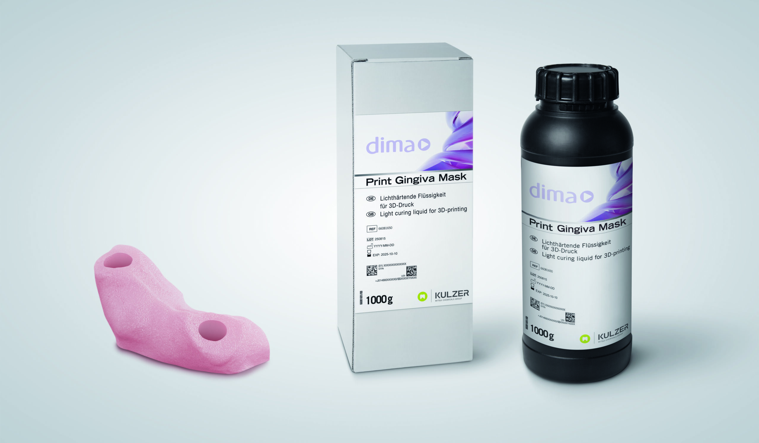 Wellenlänge 385nm und 405nm / Elastisch, flexibel und reißfest / Natürliche Farbe, Transparenz und Textur / Silikonfrei / Für Implantat- und Stumpfmodelle geeignet / Abgestimmt auf dima Print Stone beige