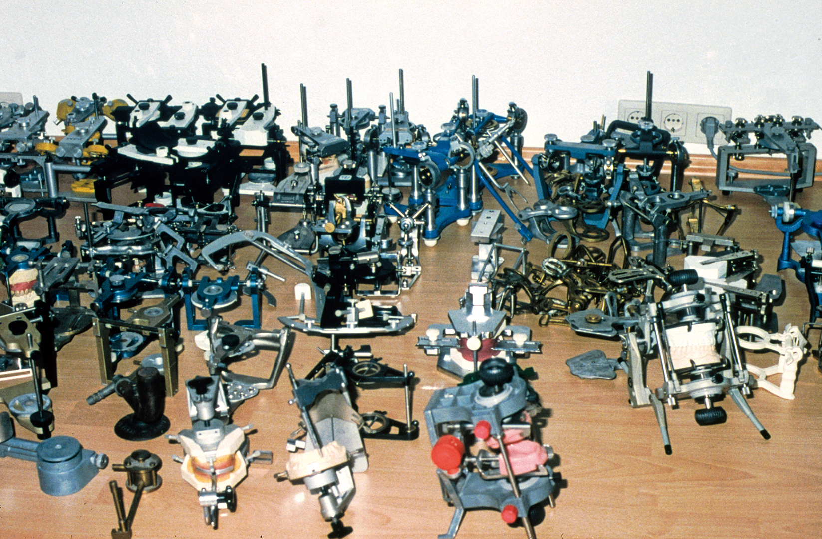 Zum Thema Gnathologie und Okklusion kam schon vieles auf den dentalen Markt, seien es Behandlungs- und Aufwachskonzepte oder jede Menge an teuren, komplizierten und mechanischen Gerätschaften: Kausimulatoren, Artikulatoren in den verschiedensten denkbaren Konstruktionen (Abb. 1), Registrierinstrumentarien (Abb. 2) und vieles mehr. Tendenz der damit einhergehenden Komplexität steigend. Alte Konzepte wurden von neuen oder wieder neu entdeckten Konzepten abgelöst oder verworfen. Viele Gerätschaften verstaubten daraufhin in Kellern und wurden von neuen, noch komplizierteren und noch teureren abgelöst. Das war wie ein Rausch, und dass, obwohl beinahe alle Konzepte und Apparaturen auf der Grundlagenforschung basieren, die vor über 100 Jahren begann und von Koryphäen wie Gysi, Hanau, Thielemann, Fritsch, Pfaff, Snow, Gritmann und so weiter vorangetrieben wurden. In dieser Zeit wurde auf die komplexe Biologie des Kauorgans ein reduktionistischer, aus der Empirie heraus entwickelter, mechanistisch-naturwissenschaftlich orientierter Diagnose- und Therapieansatz projiziert [1]. Vor diesem Hintergrund entwickelte sich die Artikulationsforschung, Funktionsanalyse und Gnathologie. Der Begriff Biomechanik wurde schon in der damaligen Zeit verwendet. Bedauerlicherweise ist ein klinischer Erfolg, so bemerkenswert er auch sein mag, kein wissenschaftlicher Beweis für den direkten Zusammenhang von Ursache und Wirkung [2]. Manche Aufwachskonzepte werden immer wieder „neu erfunden“ und mit neuen Terminologien versehen, erweitert, zerlegt und verkompliziert. Auf der Basis einfacher Dinge werden so neue Philosophien aufgebaut, die immer komplizierter und praxisfremder werden.