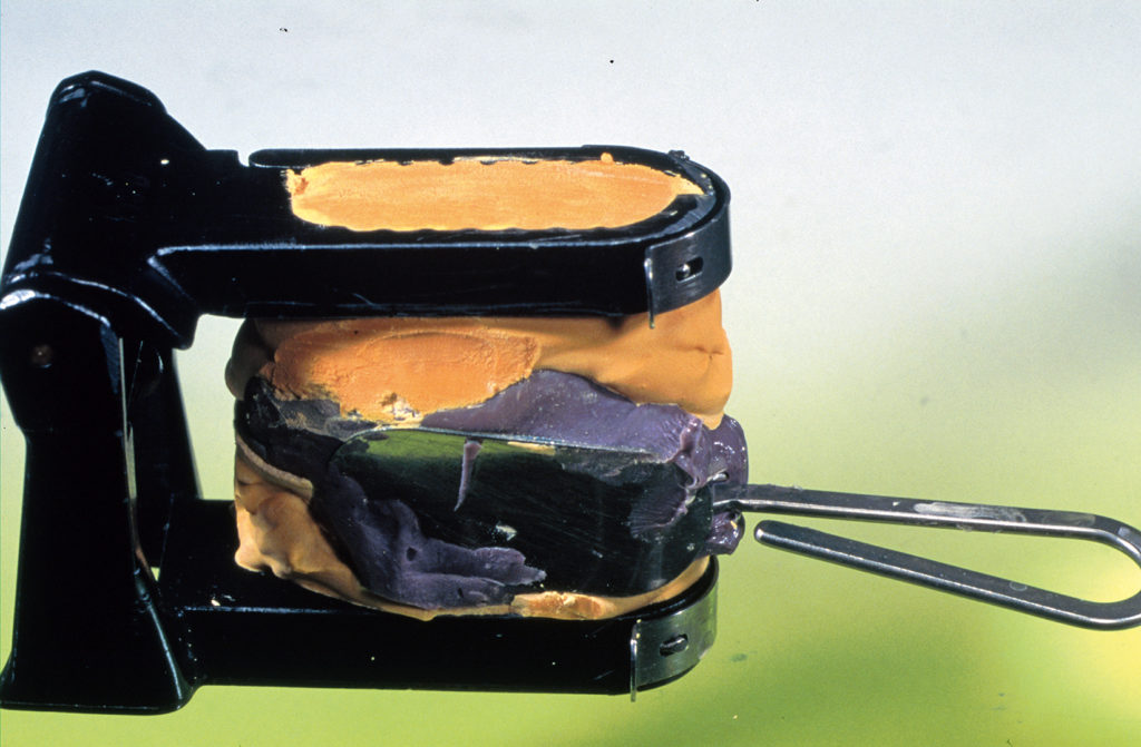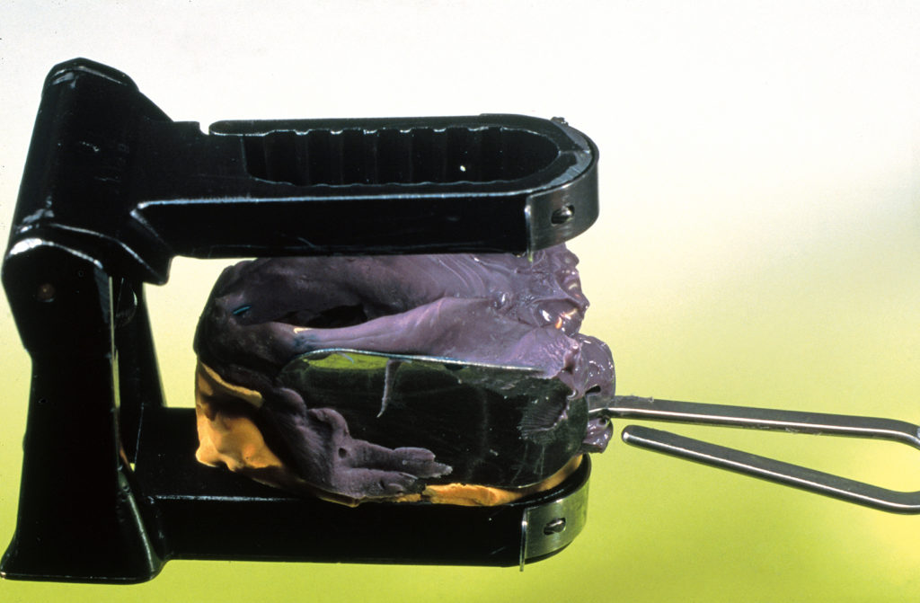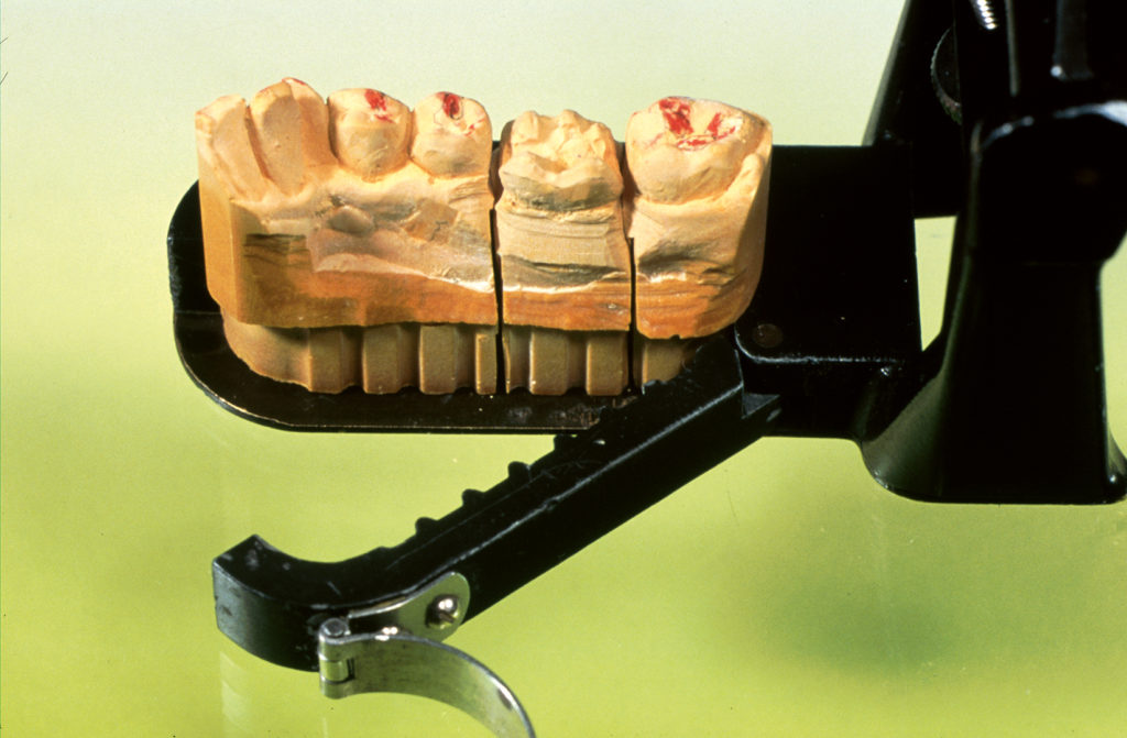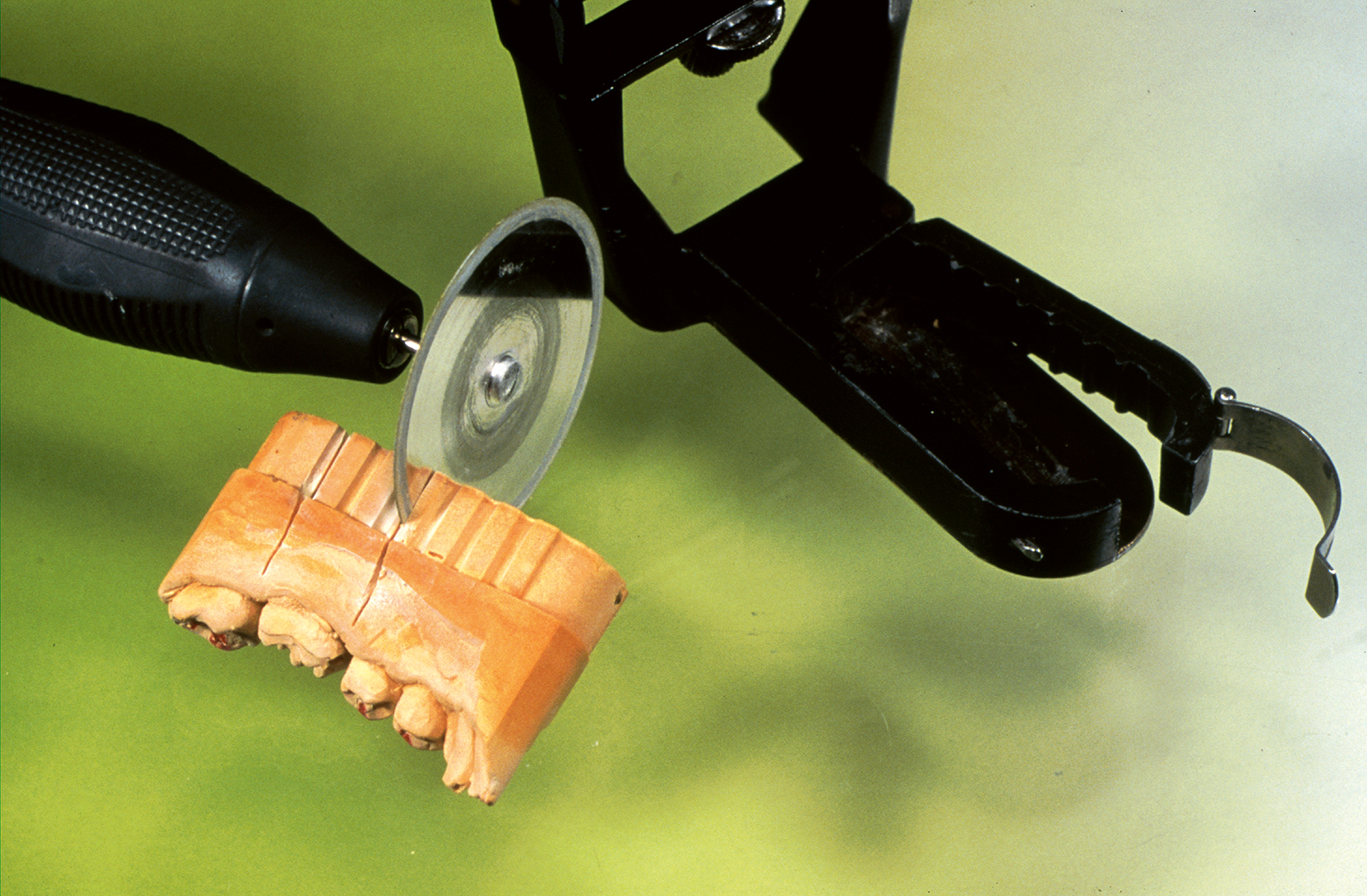 Aufgrund der Rillen am Artikulator und der aufklappbaren Teile benötigt man keine Pins, weshalb auch das Isolieren und Sockeln entfällt.
