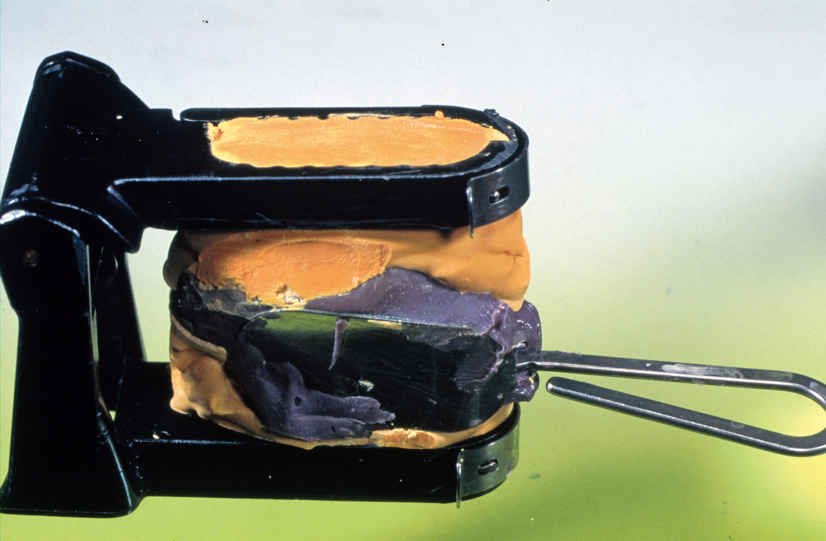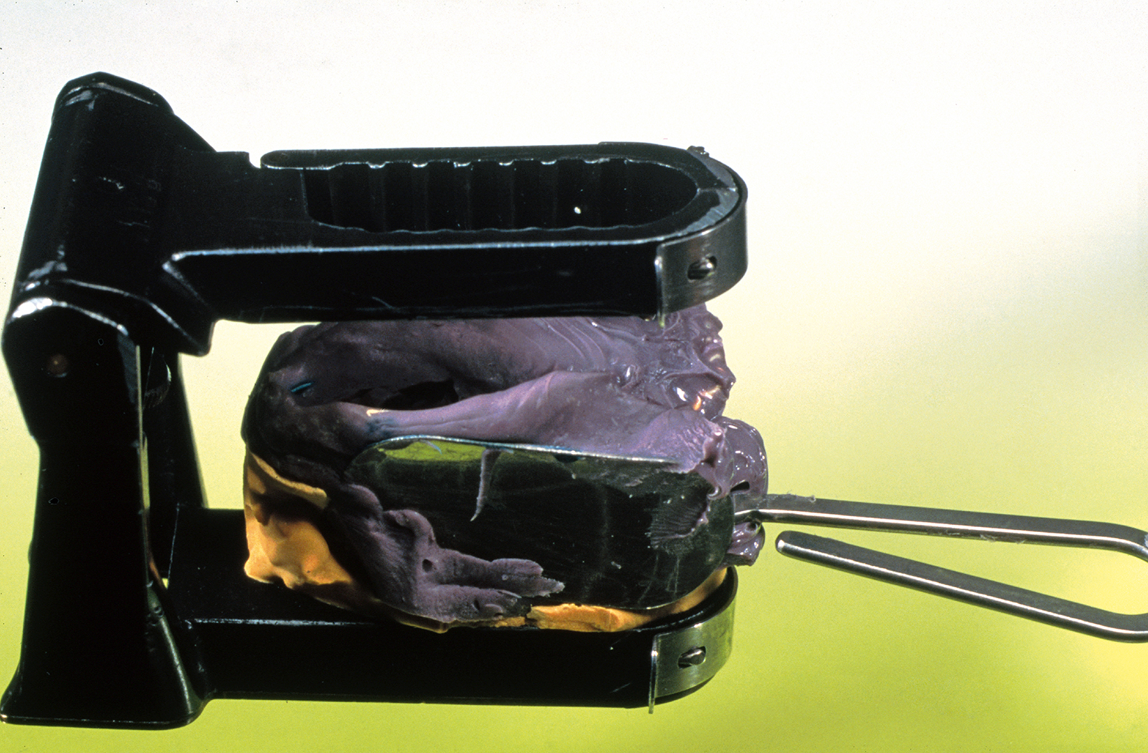 Im nachfolgenden Patientenfall wird die einfache und schnelle, aber präzise Versorgung des Zahns 46 vorgestellt, der für eine Onlay-Versorgung präpariert worden war. In der Abbildung 7 ist die Quadranten-Abformung mit Impregum und Permadyne dargestellt. Die durchgebissenen, also perforierten Stellen, bilden die im Patientenmund in der habituellen Interkuspidation tatsächlich im Ober- und Unterkiefer vorhanden Stopps in räumlich korrekter Lage zueinander ab. Obschon der großen Auswahl an Artikulatoren entschied ich mich bei dieser Quadranten-Sanierung für den einfachen Artikulator von Morita Japan (Abb. 8). Dieser Artikulator besteht aus einem Ober- und Unterteil, die beide mit Rillen versehen sind. Die beiden Teile sind aufklappbar und mit einer Feder gesichert. Der Artikulator weist eine Kondylenbahnneigung von 10° auf. Zuerst wird der Unterkiefer eingegipst, und zwar so, dass sich die Zahnreihe mittig im Unterteil befindet (Abb. 9). Der infolge des durchgebissenen Stopps auf der anderen Seite durchgelaufene Gips (Abb. 10) wird nach dem Aushärten mit einem Instrument entfernt. Im nächsten Schritt wird der Gegenbiss ausgegossen (Abb. 11). Abbildung 12 zeigt die Präparation nach dem Abheben der Abformung. Die Gipsmodelle werden aus dem Artikulator entnommen (Abb. 13) und mit einem Trockentrimmer in Form gebracht (Abb. 14). Die habituelle Okklusion wird mit Kontaktfarbe überprüft, sodass die Kontaktsituation des Ober- und Unterkiefers deutlich sichtbar wird (Abb. 15) – und das, ganz ohne Manipulation der Modelle durch Radieren oder Beschleifen. Man könnte die Quadranten-Abformung auch als dynamisch-statische Abformung bezeichnen. Nun wird das Modell mit einer diamantierten Trennscheibe von basal bis zum oberen Drittel gesägt (Abb. 16) und dann vorsichtig auseinandergebrochen. Die Bruchstelle im oberen Drittel bleibt dabei erhalten, um der Hebelwirkung entgegenzuwirken (Abb. 17). Die „Segmentblock-Bruchstelle“ verhindert ein Auslenken der einzelnen Gipssegmente auf einfache Art und Weise. Die einzelnen Segmente können daraufhin in das Artikulator-Unterteil gestellt werden (Abb. 18). Indem die eine Seite aufgeklappt wird, lassen sie sich jederzeit herausnehmen. Das für die Herstellung des Onlays benötigte Segment wird wie gewohnt für die Wachsmodellation vorbereitet (Abb. 19). Die Verzahnung und das Platzangebot von bukkal ist in Abbildung 20, die von lingual in Abbildung 21 zu sehen.