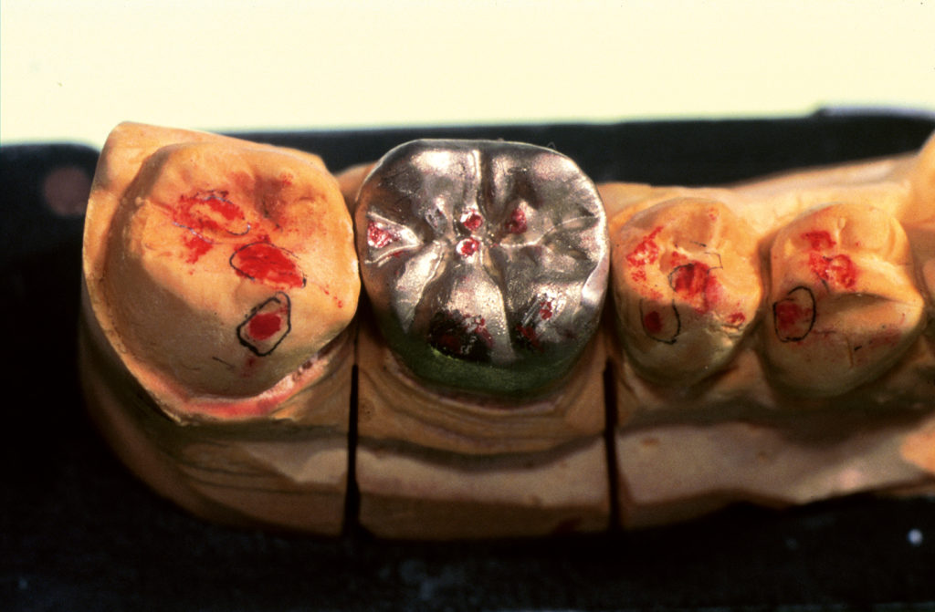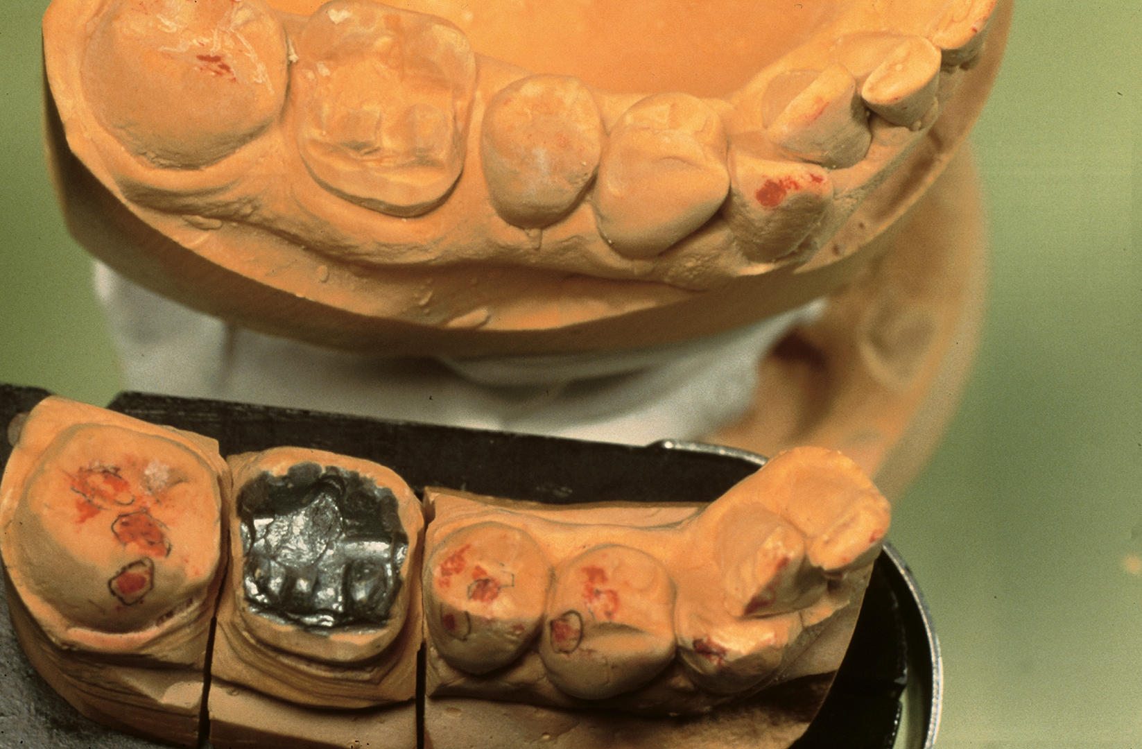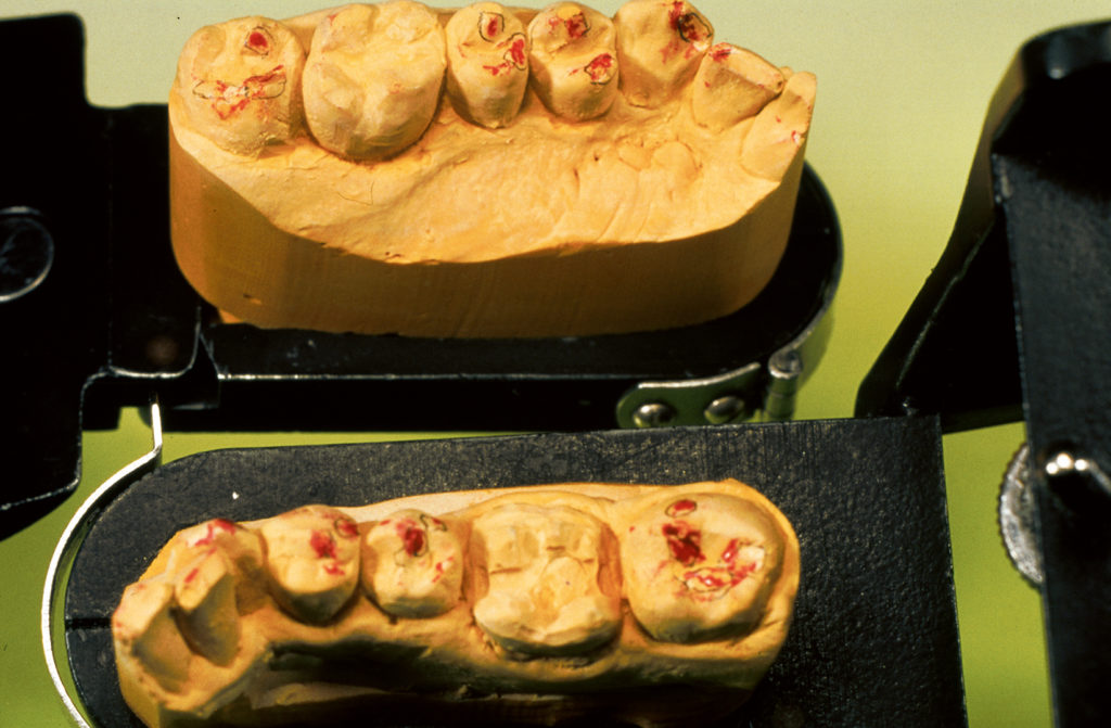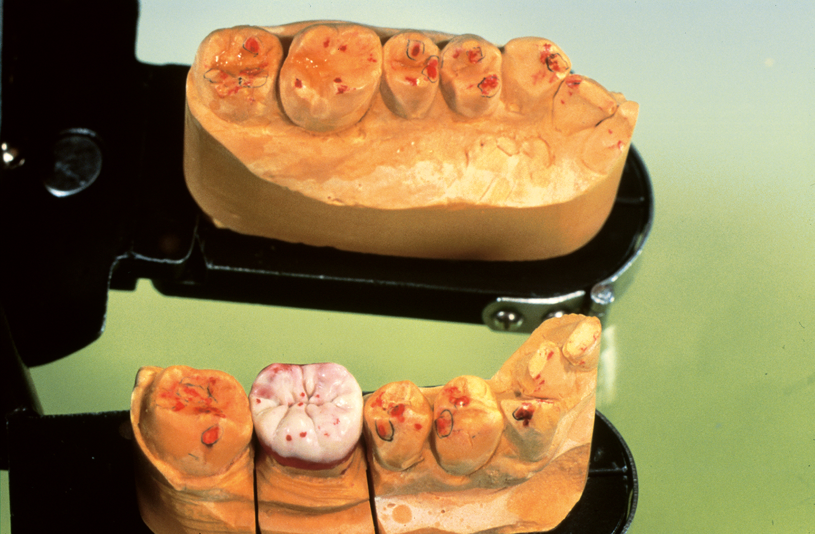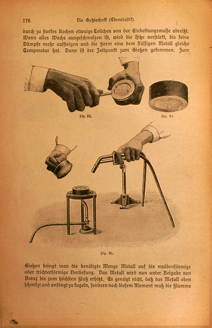 Das modellierte Onlay wird zum Einbetten vorbereitet (Abb. 26). Eingebettet wurde mit der gipsgebundenen Einbettmasse Satin Cast der Firma Kerr, die man über die Schmuckindustrie in Trommeln zu je 45 kg bekommt. Vorgewärmt wurde die Muffel, die lediglich 35 mm hoch ist, in einem kleinen Emaillierofen mit einfachster Steuerung (Abb. 27). Die Muffel wurde etwa eine Stunde nach dem Einbetten in dem auf etwa 300 °C vorgewärmten Ofen aufgesetzt. Haltezeit bei dieser Temperatur: circa eine halbe Stunde. Nach Ablauf der halben Stunde wurde der Ofen auf etwa 550 °C aufgeheizt. Haltezeit wieder circa 30 Minuten. Gegossen wurde nach dem Druckprinzip. Dieses Gussverfahren entdeckte ich in einem zahntechnischen Fachbuch aus dem Jahr 1907 (Abb. 28). In der Abbildung 29 ist der Gussstempel dargestellt, eine mit Wasser getränkte Kartonscheibe, die durch die Berührung mit der heißen Muffel schlagartig Wasserdampf erzeugt. Wenn Wasser in Wasserdampf übergeht, dann vergrößert sich das Volumen um das 1700-fache. Der daraus resultierende Wasserdampfdruck treibt die flüssige Goldschmelze in die Muffelhohlräume. Vergossen wurde eine klassische Goldlegierung. Das Gussergebnis (die drei weiteren Teile, die mitgegossen wurden, sind bereits abgetrennt, da für diesen Fall nicht relevant) ist in Abbildung 30 zu sehen. Die Kontaktpunkte mussten lediglich minimal nachgearbeitet werden (Abb. 31). Das fertiggestellte Onlay mit den zugehörigen Ausarbeitungsmaterialien ist in Abbildung 32 dargestellt. Mithilfe von selbst aus Schleiffliesmatten gestanzten Scheiben (Abb. 33) wurde daraufhin die Kaufläche mattiert (Abb. 34). Aufgrund der mattierten Oberfläche sind die Kontaktpunkte im feuchten Mundmilieu besser zu erkennen. Das fertiggestellte Onlay wird auf dem Arbeits- (Abb. 35) auf dem Kontrollmodell (Abb. 36) dokumentiert. Das eingegliederte Onlay mit den tatsächlichen Kontaktpunkten in habitueller Okklusion stimmt beinahe mit der Modellsituation überein (Abb. 37). Von der Situation wurden drei Abformungen genommen (Abb. 38): vom Gegenbiss samt präpariertem Unterkiefer, vom Unterkiefer mit eingegliedertem Onlay. Mittels eines arbiträren Gesichtsbogens (Abb. 39) wurden die Modelle schädelbezogen einartikuliert und mithilfe von Okklusionsfolie wurde die Kontaktbeziehung sichtbar gemacht (Abb. 40).