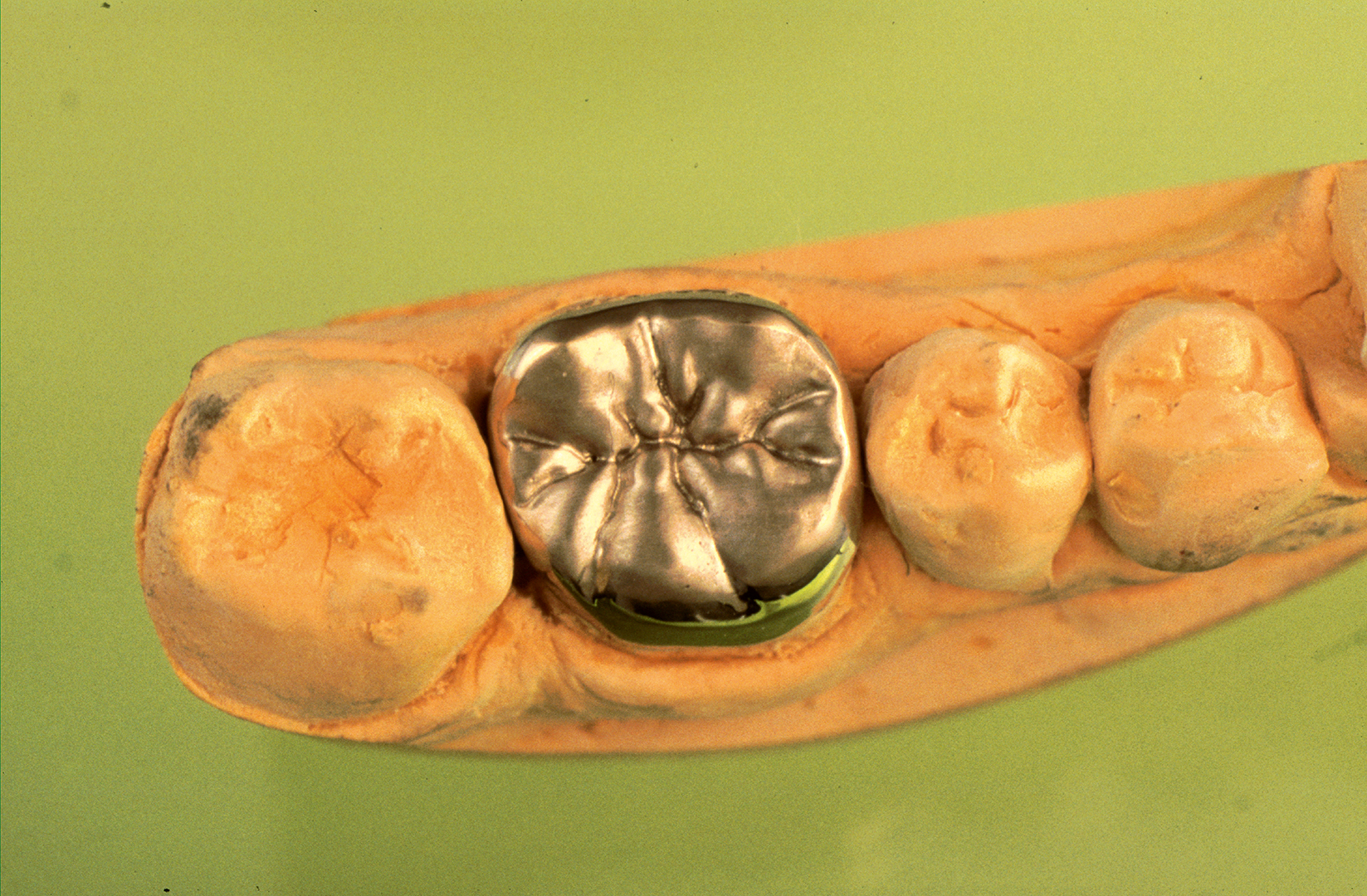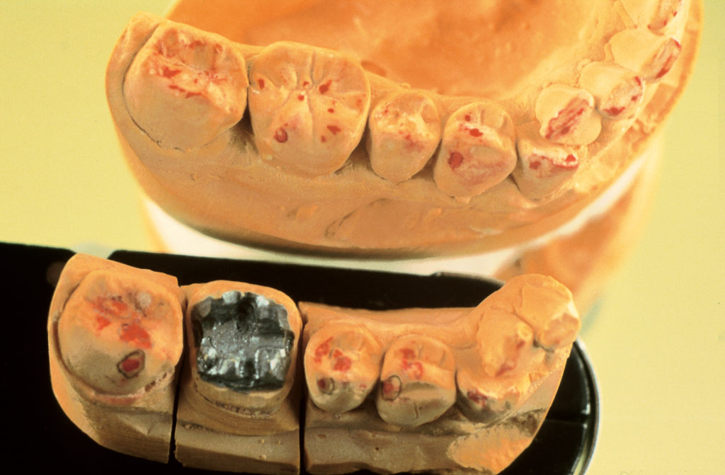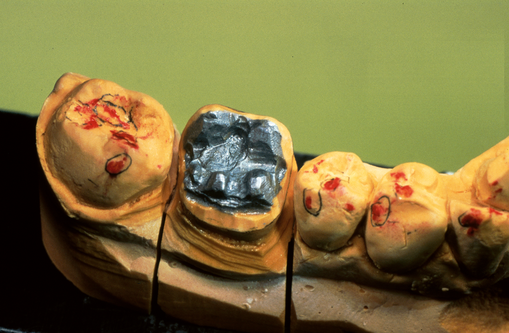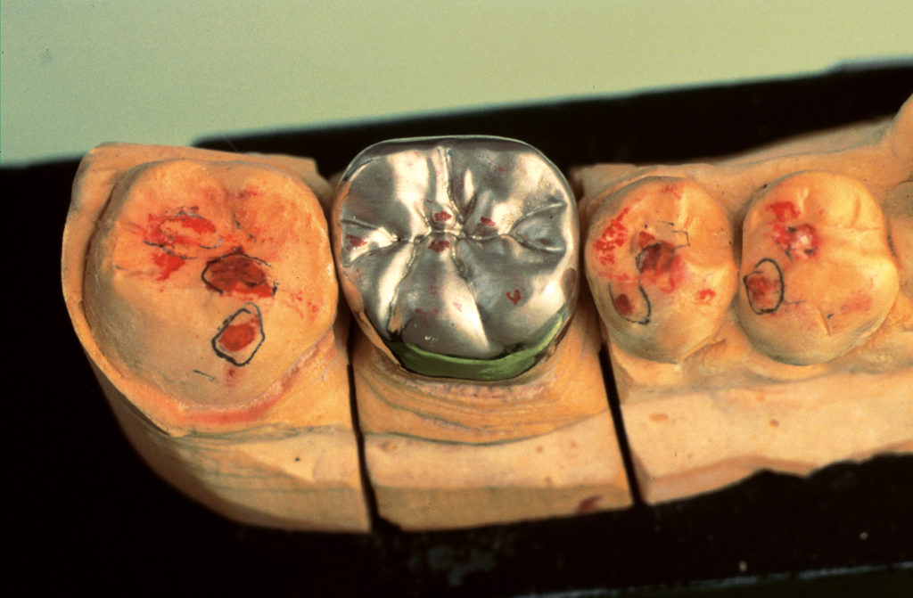 Das modellierte Onlay wird zum Einbetten vorbereitet (Abb. 26). Eingebettet wurde mit der gipsgebundenen Einbettmasse Satin Cast der Firma Kerr, die man über die Schmuckindustrie in Trommeln zu je 45 kg bekommt. Vorgewärmt wurde die Muffel, die lediglich 35 mm hoch ist, in einem kleinen Emaillierofen mit einfachster Steuerung (Abb. 27). Die Muffel wurde etwa eine Stunde nach dem Einbetten in dem auf etwa 300 °C vorgewärmten Ofen aufgesetzt. Haltezeit bei dieser Temperatur: circa eine halbe Stunde. Nach Ablauf der halben Stunde wurde der Ofen auf etwa 550 °C aufgeheizt. Haltezeit wieder circa 30 Minuten. Gegossen wurde nach dem Druckprinzip. Dieses Gussverfahren entdeckte ich in einem zahntechnischen Fachbuch aus dem Jahr 1907 (Abb. 28). In der Abbildung 29 ist der Gussstempel dargestellt, eine mit Wasser getränkte Kartonscheibe, die durch die Berührung mit der heißen Muffel schlagartig Wasserdampf erzeugt. Wenn Wasser in Wasserdampf übergeht, dann vergrößert sich das Volumen um das 1700-fache. Der daraus resultierende Wasserdampfdruck treibt die flüssige Goldschmelze in die Muffelhohlräume. Vergossen wurde eine klassische Goldlegierung. Das Gussergebnis (die drei weiteren Teile, die mitgegossen wurden, sind bereits abgetrennt, da für diesen Fall nicht relevant) ist in Abbildung 30 zu sehen. Die Kontaktpunkte mussten lediglich minimal nachgearbeitet werden (Abb. 31). Das fertiggestellte Onlay mit den zugehörigen Ausarbeitungsmaterialien ist in Abbildung 32 dargestellt. Mithilfe von selbst aus Schleiffliesmatten gestanzten Scheiben (Abb. 33) wurde daraufhin die Kaufläche mattiert (Abb. 34). Aufgrund der mattierten Oberfläche sind die Kontaktpunkte im feuchten Mundmilieu besser zu erkennen. Das fertiggestellte Onlay wird auf dem Arbeits- (Abb. 35) auf dem Kontrollmodell (Abb. 36) dokumentiert. Das eingegliederte Onlay mit den tatsächlichen Kontaktpunkten in habitueller Okklusion stimmt beinahe mit der Modellsituation überein (Abb. 37). Von der Situation wurden drei Abformungen genommen (Abb. 38): vom Gegenbiss samt präpariertem Unterkiefer, vom Unterkiefer mit eingegliedertem Onlay. Mittels eines arbiträren Gesichtsbogens (Abb. 39) wurden die Modelle schädelbezogen einartikuliert und mithilfe von Okklusionsfolie wurde die Kontaktbeziehung sichtbar gemacht (Abb. 40).