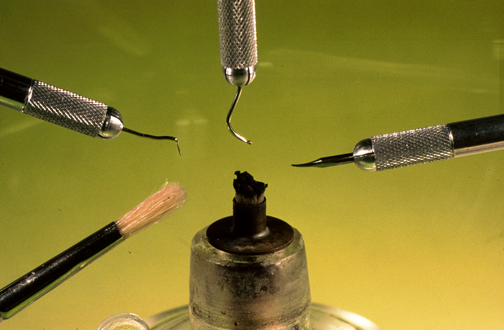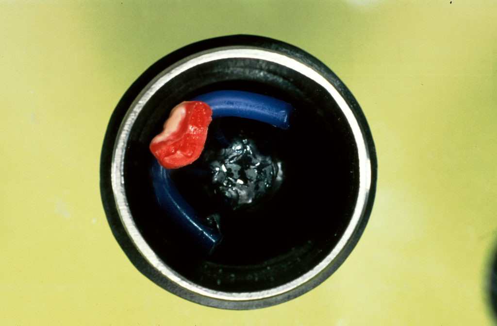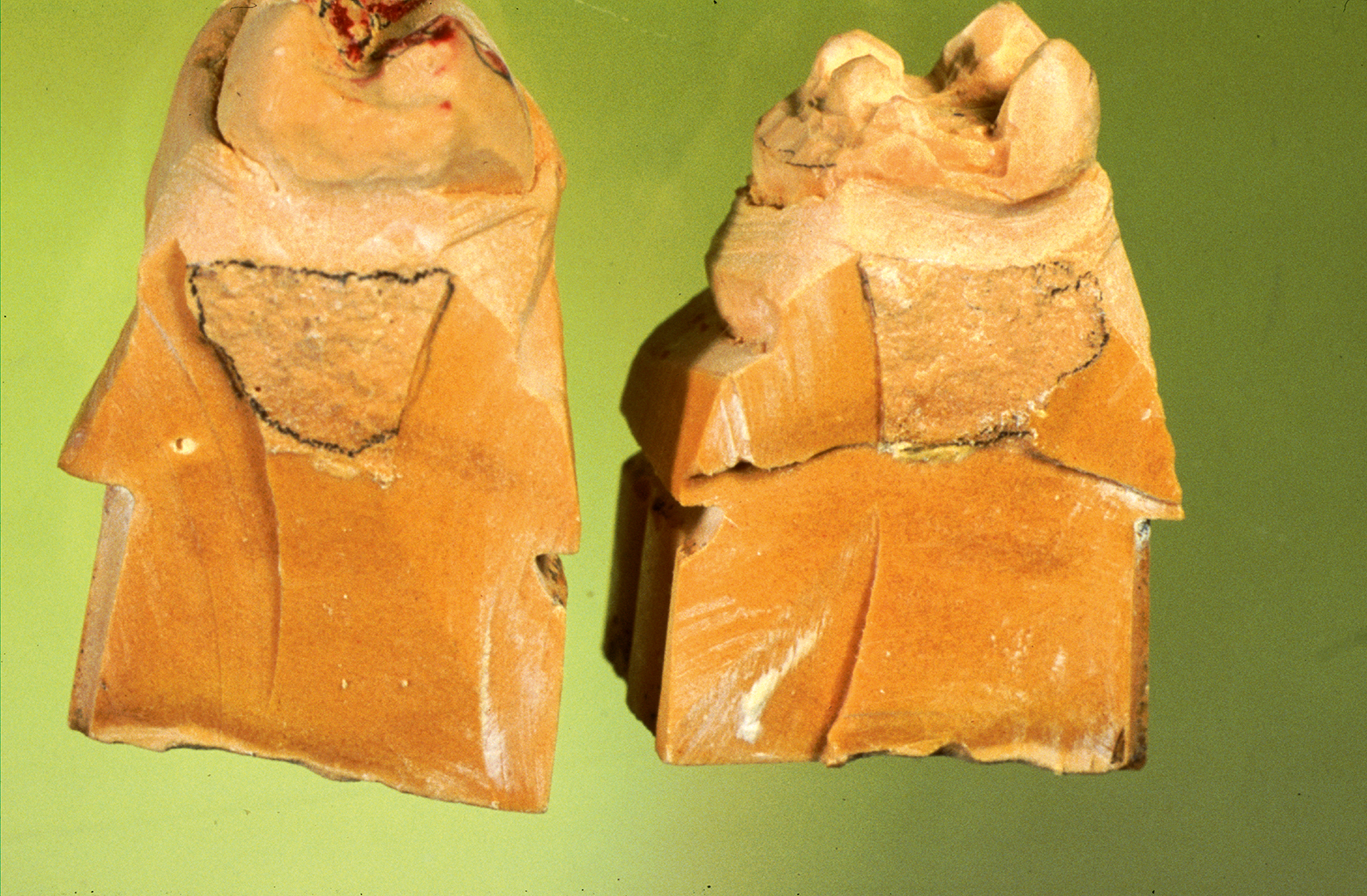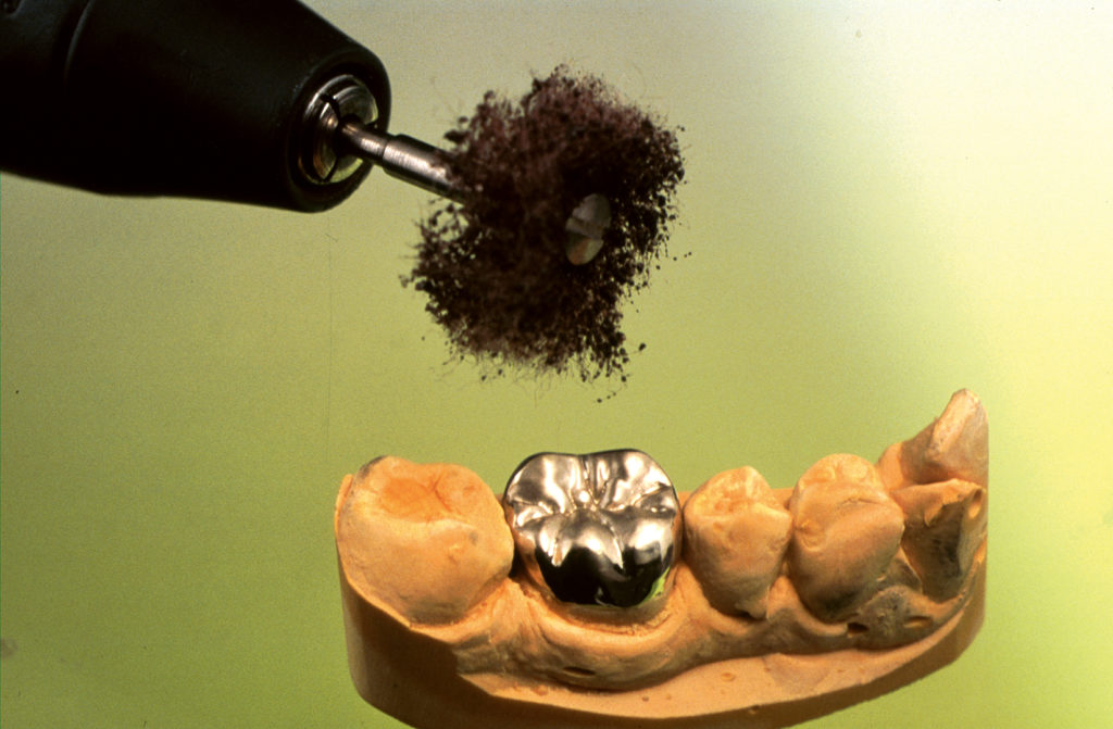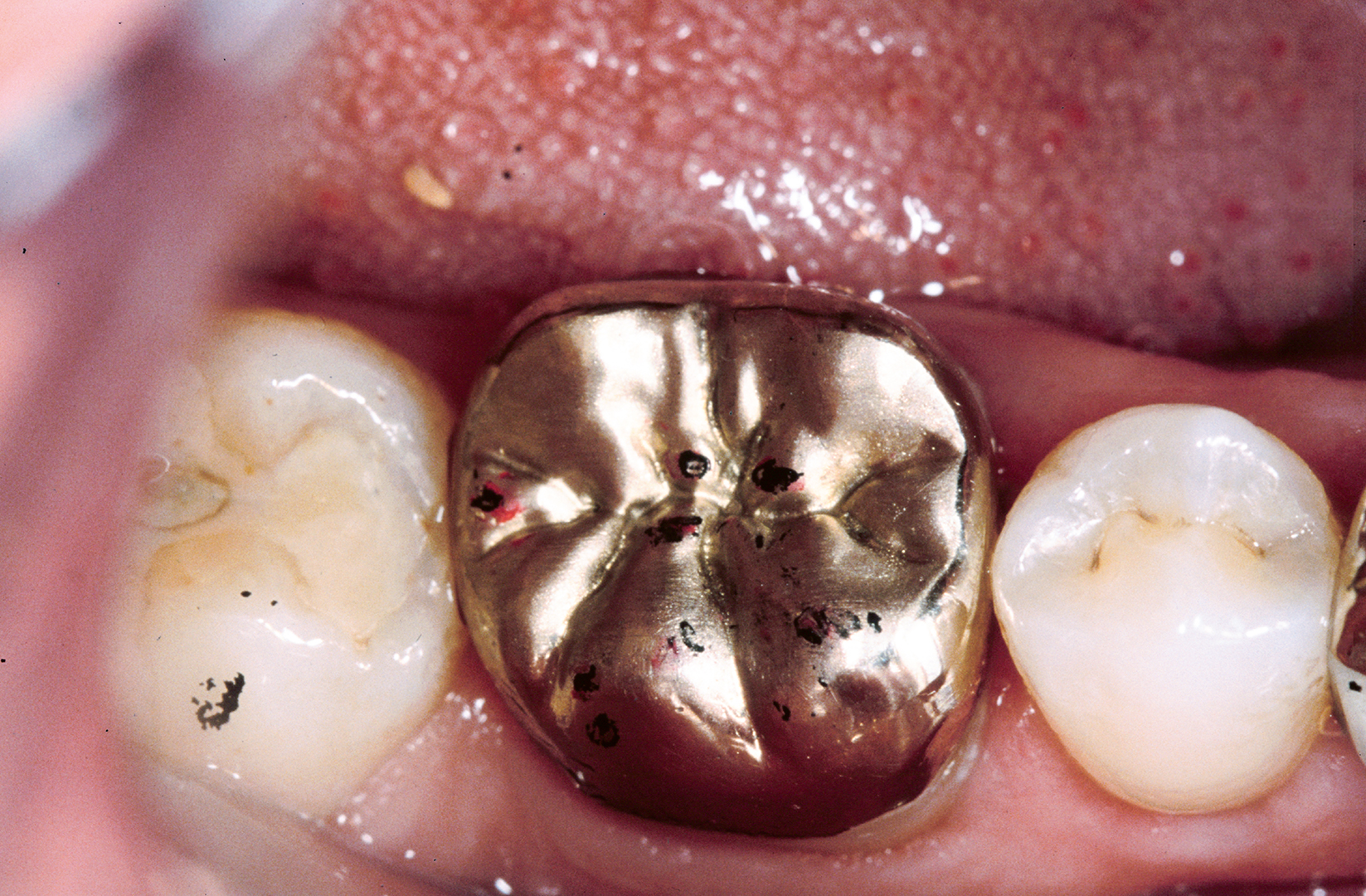 Das modellierte Onlay wird zum Einbetten vorbereitet (Abb. 26). Eingebettet wurde mit der gipsgebundenen Einbettmasse Satin Cast der Firma Kerr, die man über die Schmuckindustrie in Trommeln zu je 45 kg bekommt. Vorgewärmt wurde die Muffel, die lediglich 35 mm hoch ist, in einem kleinen Emaillierofen mit einfachster Steuerung (Abb. 27). Die Muffel wurde etwa eine Stunde nach dem Einbetten in dem auf etwa 300 °C vorgewärmten Ofen aufgesetzt. Haltezeit bei dieser Temperatur: circa eine halbe Stunde. Nach Ablauf der halben Stunde wurde der Ofen auf etwa 550 °C aufgeheizt. Haltezeit wieder circa 30 Minuten. Gegossen wurde nach dem Druckprinzip. Dieses Gussverfahren entdeckte ich in einem zahntechnischen Fachbuch aus dem Jahr 1907 (Abb. 28). In der Abbildung 29 ist der Gussstempel dargestellt, eine mit Wasser getränkte Kartonscheibe, die durch die Berührung mit der heißen Muffel schlagartig Wasserdampf erzeugt. Wenn Wasser in Wasserdampf übergeht, dann vergrößert sich das Volumen um das 1700-fache. Der daraus resultierende Wasserdampfdruck treibt die flüssige Goldschmelze in die Muffelhohlräume. Vergossen wurde eine klassische Goldlegierung. Das Gussergebnis (die drei weiteren Teile, die mitgegossen wurden, sind bereits abgetrennt, da für diesen Fall nicht relevant) ist in Abbildung 30 zu sehen. Die Kontaktpunkte mussten lediglich minimal nachgearbeitet werden (Abb. 31). Das fertiggestellte Onlay mit den zugehörigen Ausarbeitungsmaterialien ist in Abbildung 32 dargestellt. Mithilfe von selbst aus Schleiffliesmatten gestanzten Scheiben (Abb. 33) wurde daraufhin die Kaufläche mattiert (Abb. 34). Aufgrund der mattierten Oberfläche sind die Kontaktpunkte im feuchten Mundmilieu besser zu erkennen. Das fertiggestellte Onlay wird auf dem Arbeits- (Abb. 35) auf dem Kontrollmodell (Abb. 36) dokumentiert. Das eingegliederte Onlay mit den tatsächlichen Kontaktpunkten in habitueller Okklusion stimmt beinahe mit der Modellsituation überein (Abb. 37). Von der Situation wurden drei Abformungen genommen (Abb. 38): vom Gegenbiss samt präpariertem Unterkiefer, vom Unterkiefer mit eingegliedertem Onlay. Mittels eines arbiträren Gesichtsbogens (Abb. 39) wurden die Modelle schädelbezogen einartikuliert und mithilfe von Okklusionsfolie wurde die Kontaktbeziehung sichtbar gemacht (Abb. 40).