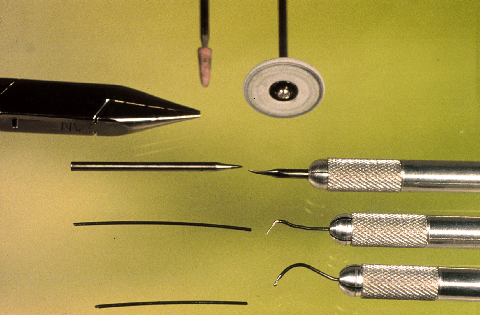 Die benötigten Modellierinstrumente stellte ich mir individuell und entsprechend meiner Bedürfnisse her. Aus einer alten Fräse fertige ich etwa durch Beschleifen und Gummieren ein Schabinstrument, aus einem Stück KFO-Draht durch Biegen, Beschleifen und Polieren zum Beispiel die beiden Wachsauftragsinstrumente (Abb. 22). Als Haltegriffe eignen sich sehr gut Schraubhaltegriffe, die man in jedem Schreibwarengeschäft erhält. Kein spezielles Modellierinstrumentarium aus dem Dentalversandhandel, selbst wenn es aus speziellen Legierungen besteht, vergoldet oder versilbert wurde, kann so individuell und maßgeschneidert sein, wie die von mir hergestellten Instrumente. Viele Kollegen vertreten die Meinung, dass man mit vielen und teuren Modellierinstrumenten bessere Ergebnisse erzielt. Allerdings kommt Zahntechniker A vielleicht mit einem bestimmten Modellierwerkzeug bestens zurecht, während das auf Zahntechniker B nicht zutrifft. Aus diesem Grund sind mehr Individualität, Flexibilität und Kreativität wünschenswert. Und die Gleichung „teures Instrument = gutes Endergebnis“ geht meiner Erfahrung nach sowieso nicht auf. Zum Erhitzen meiner individuellen Aufwachsinstrumente verwendete ich in diesem Fall eine Spirituslampe (Abb. 23), deren erzeugte Temperatur reicht völlig aus. Schon allein deshalb benötige ich keine Sonde aus einer speziellen Legierung. KFO-Draht ist völlig ausreichend. Modelliert wurde mit einem handelsüblichen Modellierwachs. Bei dentalen Modellierwachsen liegen der Erweichungs-, Schmelz- und Erstarrungspunkt bei relativ niedrigen Temperaturen (je nach Wachsmischung zwischen 50 und maximal 90 °C). In Abbildung 24 ist die rationell und mit einfachsten Mitteln aufgewachste Krone mit der künstlich auf das stomatognathe System auferlegten Kaufläche dargestellt. Die darauf zu findende Kontaktpunkte sind nur als Orientierungshilfen für das neuromuskuläre System zu sehen. In der Abbildung 25 ist die Kontaktpunktsituation dargestellt – sie spiegelt lediglich die individuellen zentrischen Kontakte wider. Die Kontaktpunkte wurden beim Aufwaschen des Onlays auf ein Minimum reduziert.