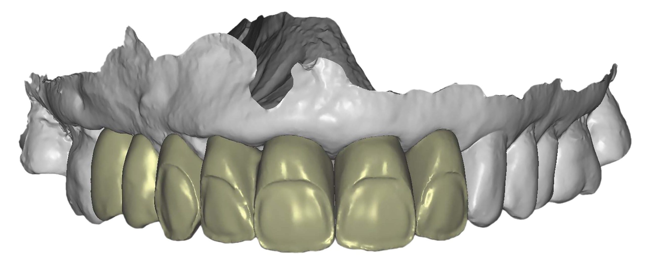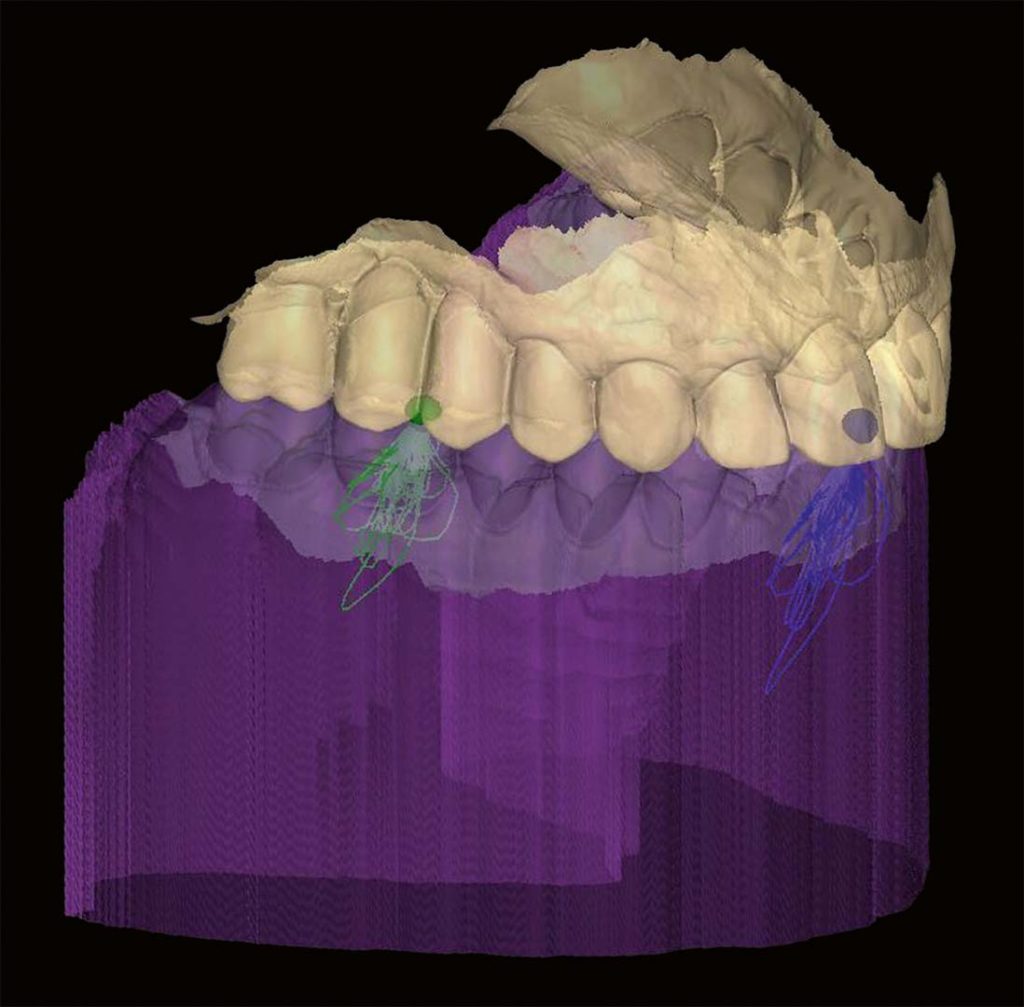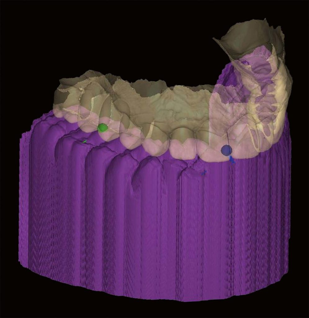 Wir brauchen keine Referenzpunkte, gedachte anatomische Ebenen, mathematisch präzise Bahnen und Winkel et cetera, sondern reelle Bewegungsaufzeichnungen. Dadurch relati­viert und vereinfacht sich alles von selbst und es entsteht auf einfache Art und Weise funktionstüchtiger Zahnersatz. Die Restauration kann im Vorfeld somit virtuell getestet und geprüft werden, was die Stuhl-/Behandlungszeit in der Praxis enorm verkürzt. Ziel ist es, wie in der FGP-Technik (functionally generated pathway technique) aus den 1930er Jahren, einen Gegenkiefer/Antagonisten so zu generieren, dass er die dynamischen Schluck-, Kau- und Sprechprozesse als statisches Modell beinhaltet. Somit kann der Zahnersatz nur mit „Auf- und Zubewegungen“ konstruiert werden. Für Full-Mouth- und Ästhetikrestaurationen benötigt man dann doch noch gedachte Ebenen und Referenzpunkte, welche einfach zu realisieren sind (Abb. 83). Beim CMD-Patienten sind diese realitätsgetreuen Aufzeichnungen/Registrierungen bei der Unterkieferbewegungserfassung wichtige Entscheidungs-/Diagnosehilfen für die Therapie, um daraus weitere therapeutische Entscheidungen treffen zu können. Die Herausforderung bei „Real Movement“-Aufzeichnungen ist, die Start- und Endposition fest­zulegen. Die „Eindringtiefe“ der Zähne, egal ob digital oder analog, kann nur durch Kompression der Zahnreihen im Schlussbiss erreicht, gemessen und aufgezeichnet werden. Kompression und Dekompression sind der Dreh- und Angelpunkt, bei dem sich entscheidet, ob eine Restauration zu hoch oder zu niedrig ist, also Supra- oder Infraokklusion. Ein wichtiger Punkt für den Erfolg einer prothetischen Restauration ist die Kompensationsfähigkeit des Patienten mit seinen gesamten mastikalen und neuromuskulären Komponenten. Die individuelle Kompensationsfähigkeit ist allerdings noch nicht messbar. Wir Zahntechniker müssen davon ausgehen, dass alle Restaurationen, die zu uns ins Labor kommen, keinen pathogenen Hintergrund haben. Dies festzustellen ist Aufgabe des Behandlers beziehungsweise Co-Therapeuten, welcher die Patientenanamnese durchführt. Die Interpretationsfreiheit, wo pathogen anfängt, ist nicht immer klar definiert. Es ist eine unscharfe Grenze: Wo endet Gesundheit und wo fängt Krankheit an? Da wir mittlerweile viel Erfahrung im Bereich des modelllosen Arbeitens gesammelt haben, ist es zur Routine geworden.