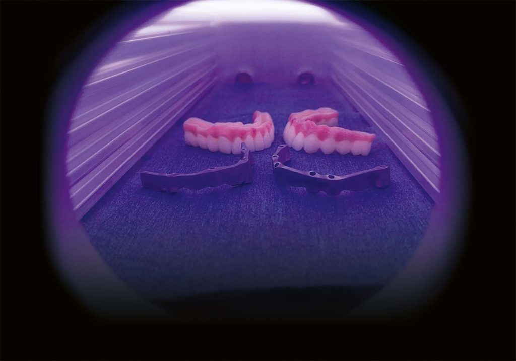 CADdent hat seine Fertigungsverfahren um die hochpräzise HYBRID-Fertigung ergänzt. Diese innovative Fertigungsmethode vereint die Vorteile des LaserMelting-Verfahrens mit der CNC-Technik, und ist somit ideal für teleskopierende sowie okklusal direkt verschraubte Arbeiten geeignet. Besonderes Augenmerk liegt bei der inhouse Weiterentwicklung des Fertigungsverfahren auf der Präzision, so kann CADdent nun eine durchgängige Vestibulärfläche mit einer Dicke von nur 0,4 - 0,5 mm realisieren. Zudem ist CADdent das einzige Fertigungszentrum in Deutschland, das die Bearbeitung von Titan im Hybrid-Verfahren anbietet.