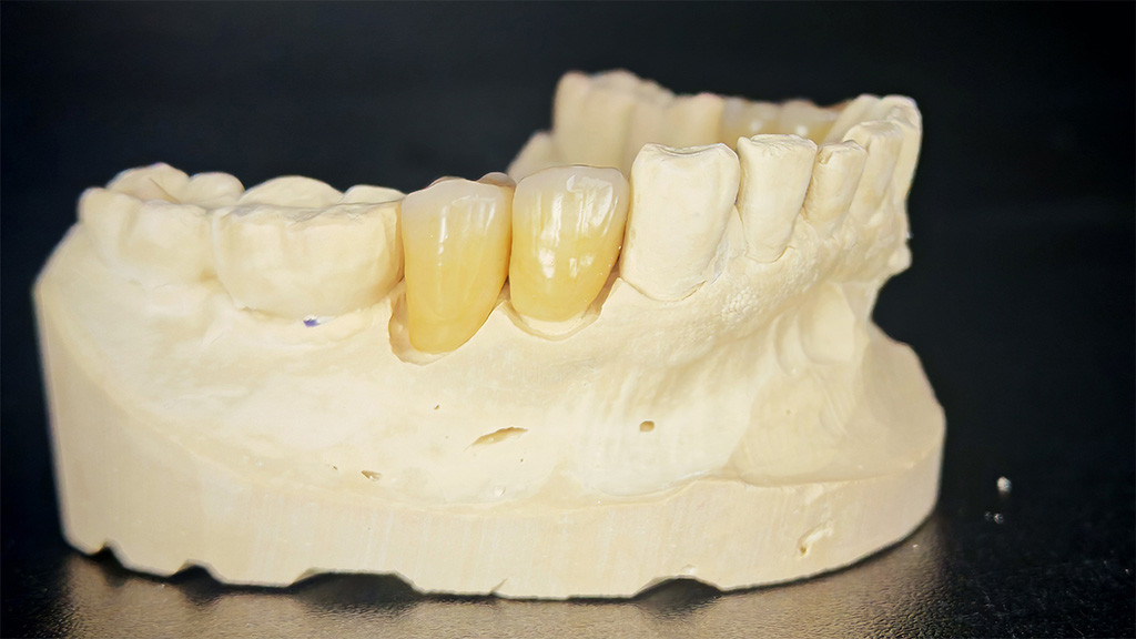 „Die Arbeit war eine klassische Seitenzahnversorgung – 34, 35, 44, 45“, erzählt Ztm. Jessica Hihn. „Was die Sache spannend gemacht hat, war der gingival unterstützte Kronenrand. Der sollte funktional sauber sitzen, aber gleichzeitig wollten wir eine grazile, natürliche Ästhetik – kein Klotz im Seitenzahnbereich.“