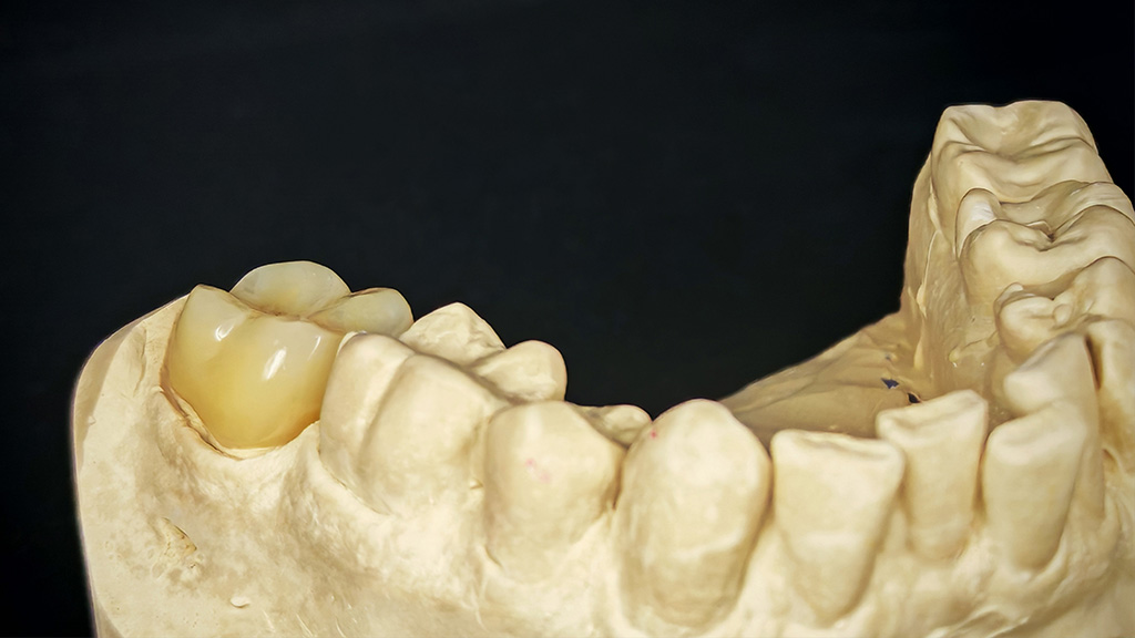 Eine weitere Krone wurde monolithisch aus dem dima Mill Zirconia Multi Zirkonoxid A3 gefräst und glasiert.