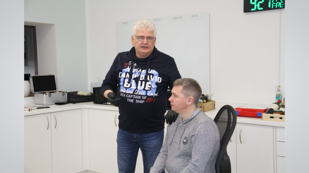 Nun ging es in die Dresdener Dependance des Dentaldepots Gerl. Hier warteten die Patientin und die Zahnärztin Dr. Beate Gängler schon, um den Kursteilnehmern nun live zu zeigen, worin die Probleme der Patientin liegen, was ihre Wünsche sind und welch tragende Rollen dem Gesichtsbogen und dem primobyte-Biss zuteil werden. Dazu wurde der Patientin der vorab am Modell gefertigte primobyte-Biss eingesetzt und bewiesen, dass dieser perfekt passte. An dieser Stelle konnten somit erste Übertragungsfehler ausgeschlossen werden. Anschließend durften sich die Kursteilnehmer ihre angefertigten Bisse gegenseitig einsetzen und überprüfen. Das beeindruckende Ergebnis: Jeder einzelne Biss passte perfekt und nichts wackelte.