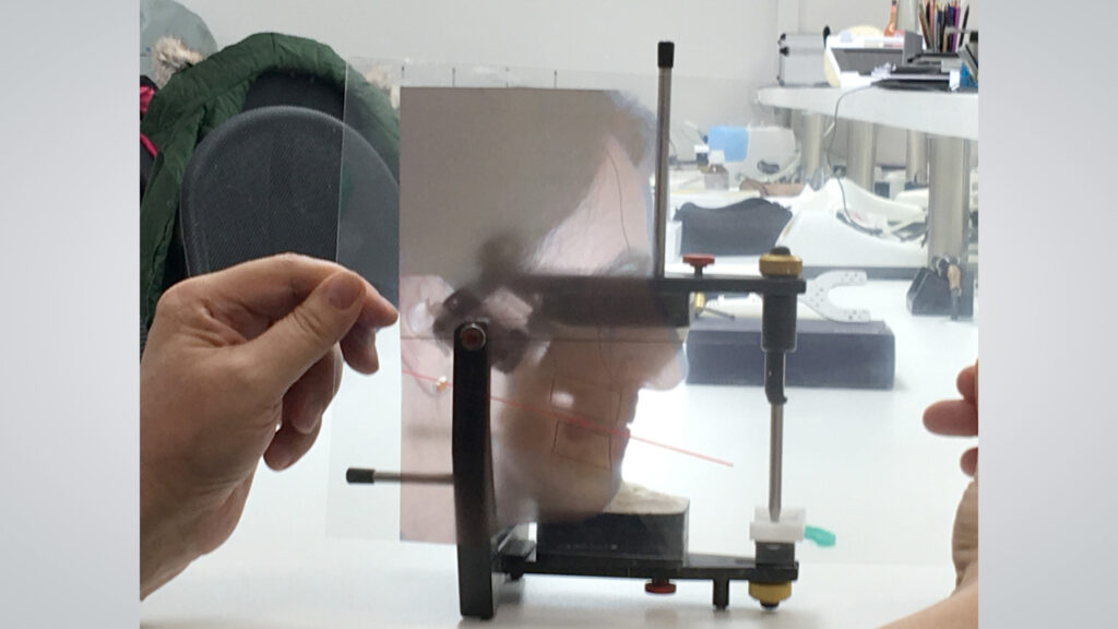 Anhand eines echten Patientenfalls aus dem Hause UniQDental demonstrierte Ztm. Stefan Schunke, wie sich komplexe Restaurationen selbst auf große Distanzen bewerkstelligen lassen. Wichtigste Grundlage: der Gesichts- respektive Transferbogen. In einem ersten Schritt zeigte er den Teilnehmern, wie sie einen Gesichtsbogen korrekt anlegen. „Das ist alles kein Hexenwerk“, erläutert er das Vorgehen. Sein wertvoller Tipp: „Einen Klecks Putty auf das Nasion geben, dann drückt das Konstrukt nicht mehr so und wird angenehmer für den Patienten.“ Anschließend durften die Teilnehmer sich gegenseitig den Transferbogen anlegen.