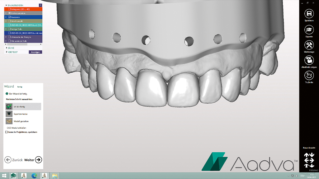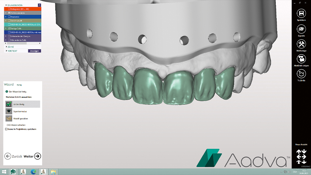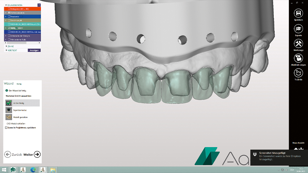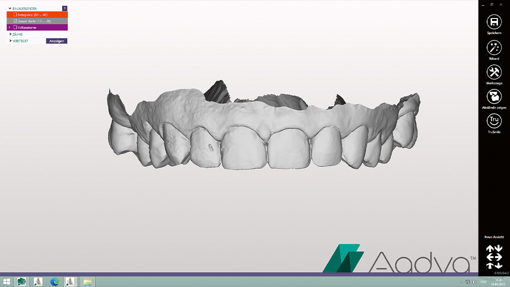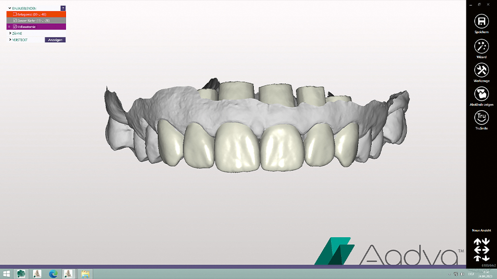 Vor jedweder invasiven Maßnahme bildet das Mock-up die Grundlage für die Simulation der angestrebten Veränderungen. Vorbereitend wurden in der Praxis Füllungsdefekte sanft verschliffen und geglättet. Um Spielraum für das Wax-up zu gewinnen, wurden die Zähne von vestibulär leicht beschliffen, wobei kaum natürliche Zahnsubstanz touchiert worden ist. Nach dem Scannen der Situation konnte im Labor das digitale Wax-up konstruiert werden. Der Scan zeigte, dass die feine Reduktion der vestibulären Bereiche Platz für die Gestaltung der Zähne 13 bis 23 geschaffen hat (Abb. 2). Für das Wax-up nutzen wir gern die Zahnbibliothek „Frontzahnkollektion Anteriores“ von Dr. Jan Hajtó – ein Add-on in der CAD-Software (exocad). Diese ermöglicht es, natürliche Zahnformen effizient und fast intuitiv zu gestalten. Das digitale Wax-up entsteht so mit wenigen Klicks (Abb. 3).