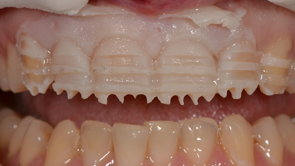 Bis zu diesem Zeitpunkt waren die natürlichen Zähne fast unberührt geblieben, abgesehen von dem leichten vestibulären Glätten der Kunststofffüllungen. Diese zurückhaltende Herangehensweise unterstreicht den Anspruch, so minimalinvasiv wie möglich zu arbeiten. Für die schonende Präparation der Zähne diente das Mock-up als „Schablone“. Mit einem Rillenschleifer konnte durch das Formteil hindurch präpariert werden, was eine exakte Kontrolle über die Tiefe der Präparation erlaubte (Abb. 5 und 6).