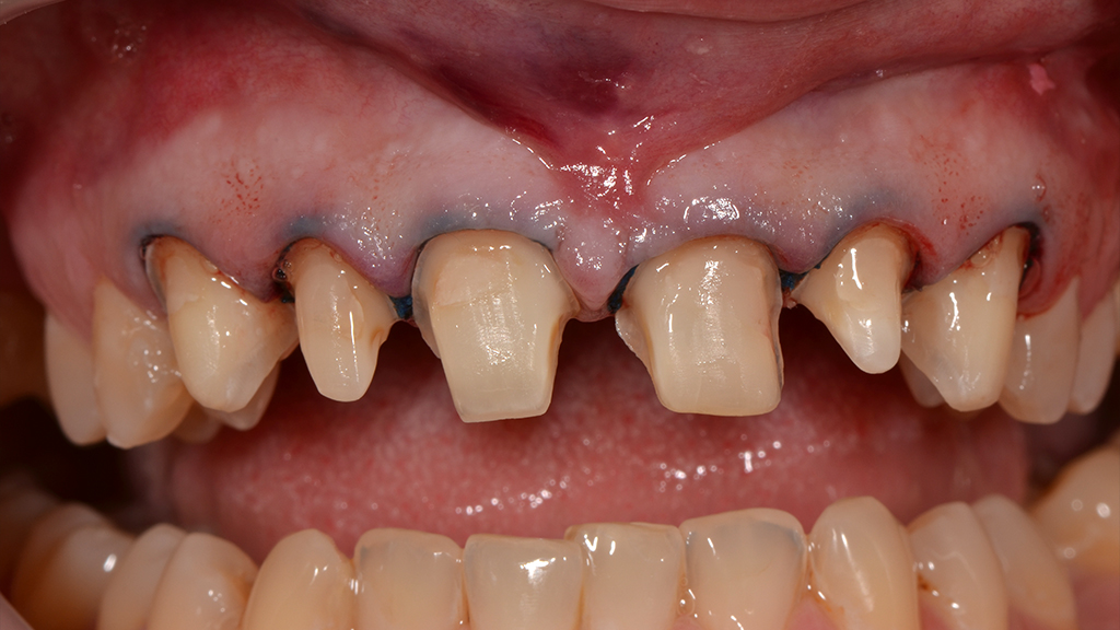 Die Zähne 12 und 22 sollten mit Vollkeramikkronen versorgt werden. Für die Zähne 11 und 21 sowie 23 und 33 entschieden wir uns für Teilkronen, da die palatinalen Flächen noch als Führungsflächen vorhanden waren. Das differenzierte Vorgehen erlaubt eine optimale Balance zwischen Ästhetik und Zahnerhalt. Auf der Basis des Silikonschlüssels konnte im Chairside-Verfahren das Provisorium zum Schutz der frisch präparierten Zähne angefertigt werden (Abb. 7 und 8). Parallel dazu diente das digitale Mock-up im Labor als Referenz für die Herstellung des Langzeitprovisoriums.