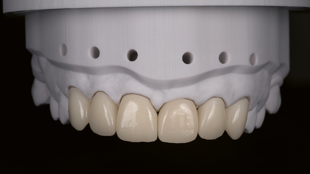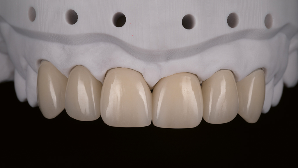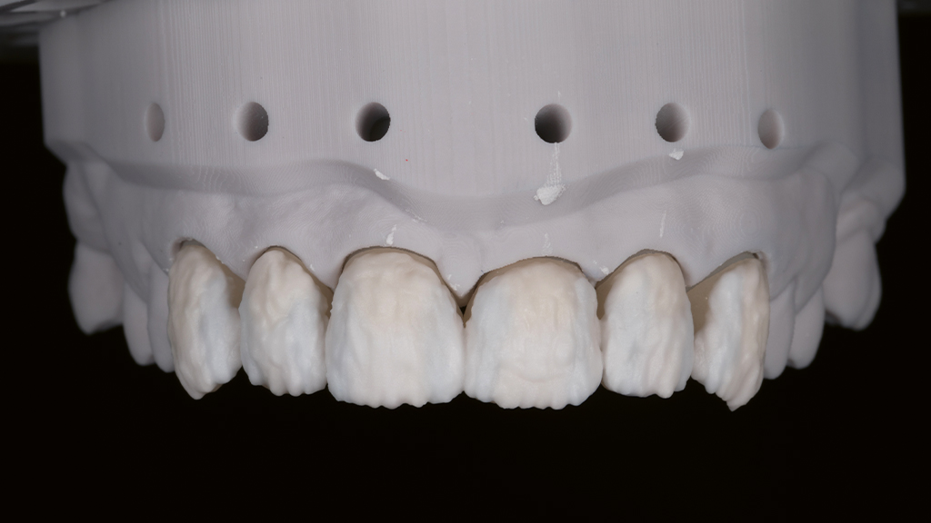 Basierend auf einem weiteren digitalen Scan (Aadva Lab Scan, GC) ist im Labor ein neues Modell hergestellt worden. Das CAD-Design des Modells wurde in die Modellsoftware (Shera) übertragen, ein Modell mit herausnehmbaren Stümpfen konstruiert und ausgedruckt. Anhand der intraoral definierten Situation wurde das Langzeitprovisorium konstruiert und ebenfalls mittels 3D-Druck hergestellt (Abb. 9). Es folgten die Ausarbeitung, Feinanpassung und Politur (Abb. 10). Mit der intraoral eingegliederten provisorischen Restauration konnten nun Passform, Ästhetik und Funktion nochmals im Mund der Patientin beurteilt werden (Abb. 11).
