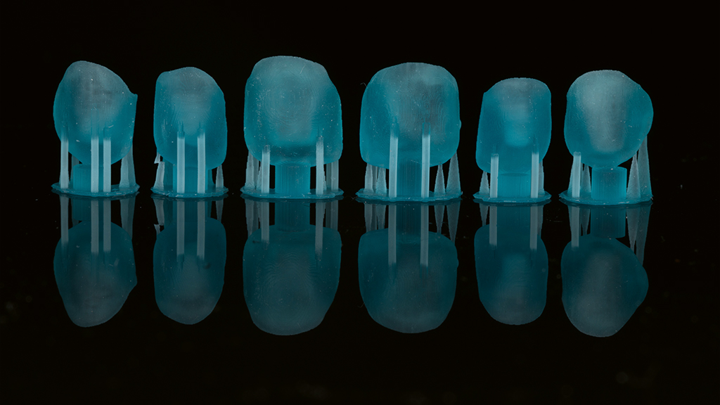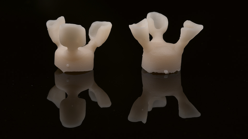 Der digitale Datensatz diente als Grundlage für die Gerüste. Nach einer Formkorrektur erfolgte das Cut-Back (ca. 0,2 bis 0,3 mm), wobei die Inzisalkante monolithisch blieb (Abb. 12 und 13). Der Übergang von der digitalen Konstruktion zum physischen Objekt erfolgte mittels 3D-Druck. Die Gerüstkappen wurden direkt mit den Presskanälen gedruckt (Abb. 14). Hierbei stellt die Kombination von 3D-Druck und Presstechnik hohe Anforderungen an das ausbrennbare Resin. Das Material muss eine hohe Präzision aufweisen und darf weder aufquellen noch unerwünschte Rückstände hinterlassen. Ebenso muss es sauber ausbrennen, um Mikrorisse in der Pressmuffel oder gar ein Platzen der Muffel zu vermeiden. Wir wählten einen speziellen 3D-Druck-Kunststoff für die Presstechnik (HP Dent). Nach dem Druck zeigten die Gerüstkappen detaillierte, fein auslaufende Ränder und waren nahezu perfekt. Es war lediglich ein feines Gummieren notwendig, um die Gerüste für die weitere Verarbeitung vorzubereiten.